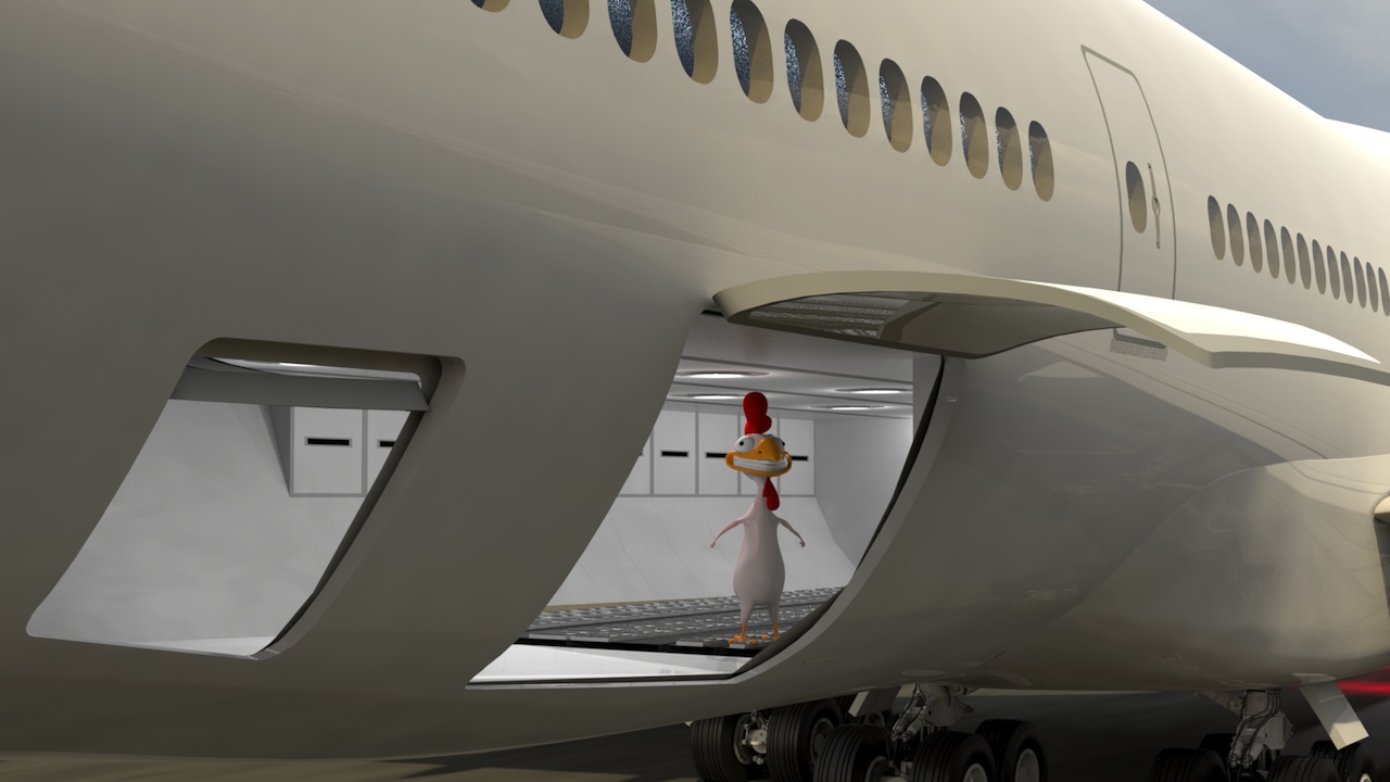 Below: Cargo bay and cabin details. (Giant MODO chicken not included.)
