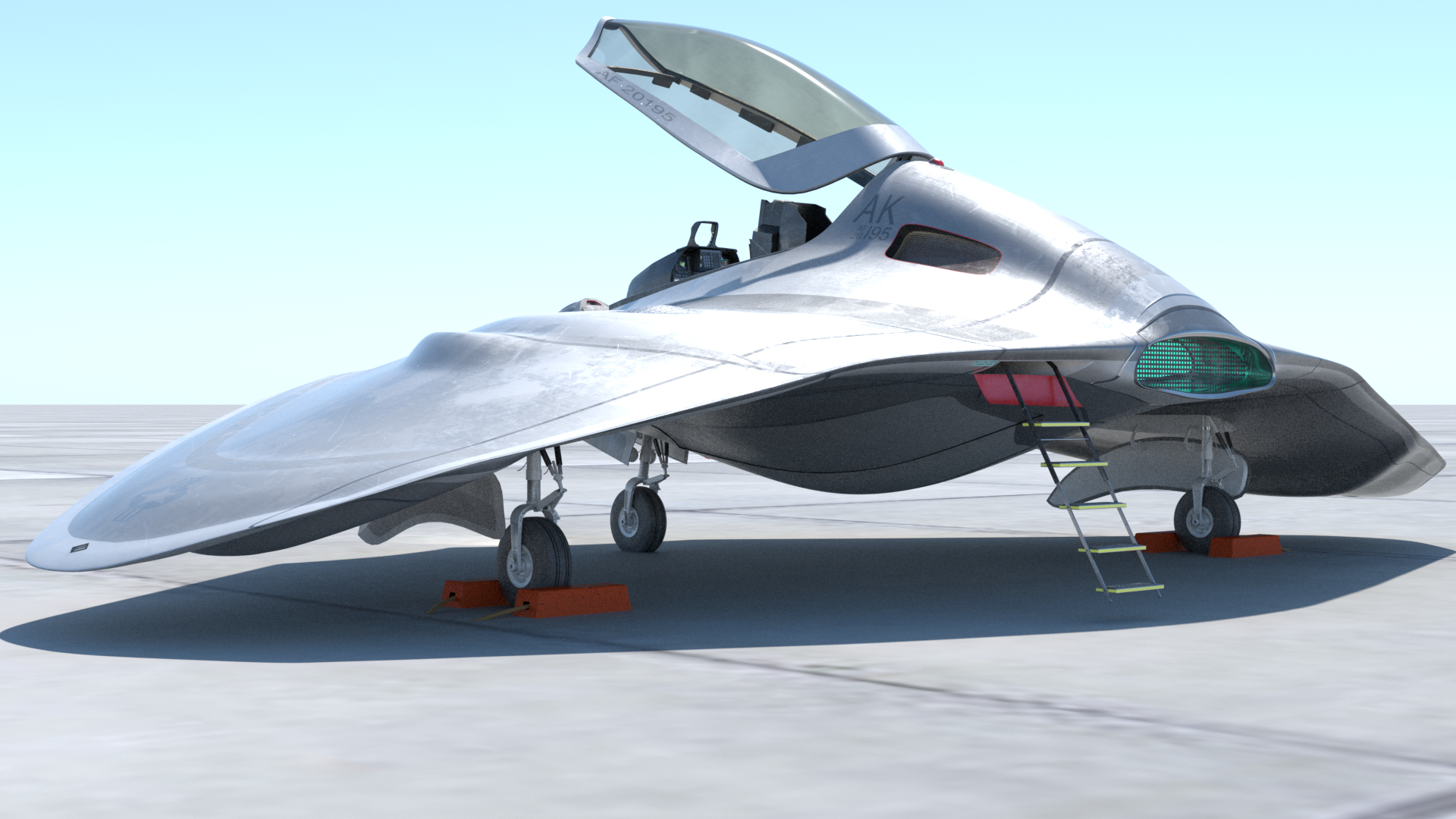 Designed to operate in the atmosphere, under water, or in space, equally well. In native MODO format, it includes a pop-up controller allowing you to animate the complete interior and exterior lighting system, turn the pilot's head, open and close the canopy, retract and extend the landing gear, open and close the weapons bay doors, open and close a nose cone containing an emitter weapon, a retractable boarding ladder, and even includes a slider to vary the "wear and tear" from a new, factory look, to a worn and scratched effect. All wheels rotate properly when moved along the ground.