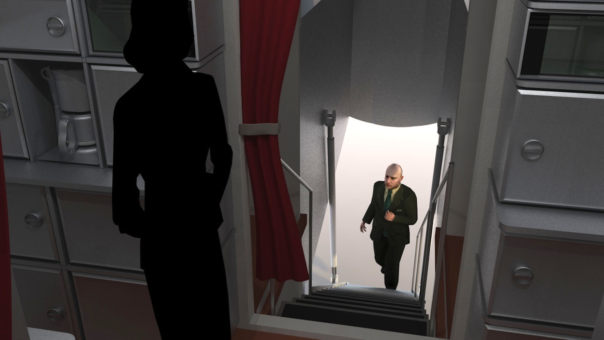 Once the floor was established I created an interior cabin liner, with the lighting, overhead compartments, heating ducts at the bottom, etc.. Next, I added 120 seats in the cabin, and three (different) seats in the cockpit, along with an animatable door, shown open here.