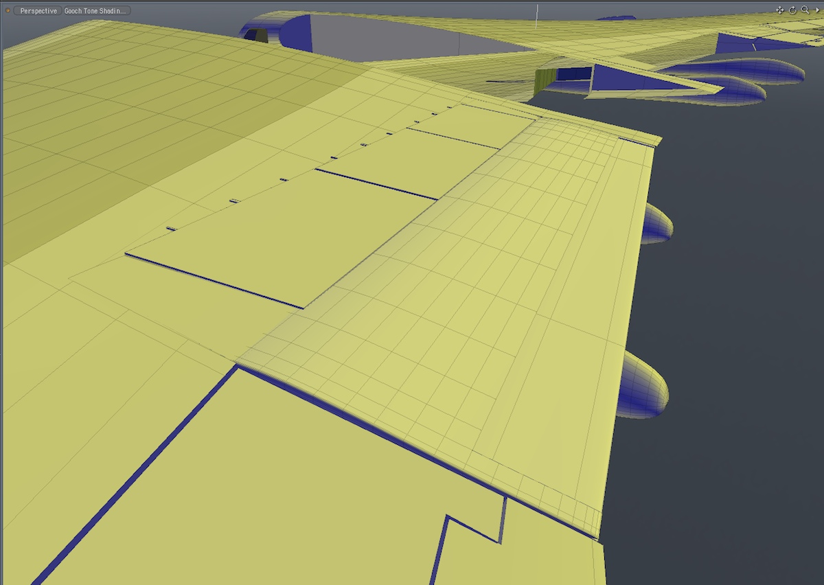 You'll see in recent images of the wing, I had built a single-piece (inboard and outboard) flap, and had positioned slices to show me where the three flap segments went. So, I began by creating two copies (for a total of three) of each of those flap pieces. That way, I could slice off the appropriate parts, and remodel the leading or trailing edges, to create the shapes you see below.