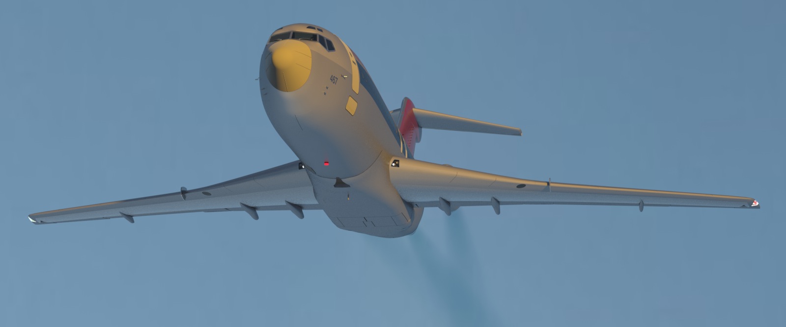The low-res test below shows the aircraft as the engines spool up, just before the start of takeoff. You'll notice that the darkness of the jet exhaust increases as the speed increases, so it's quite dense when the plane moves away.