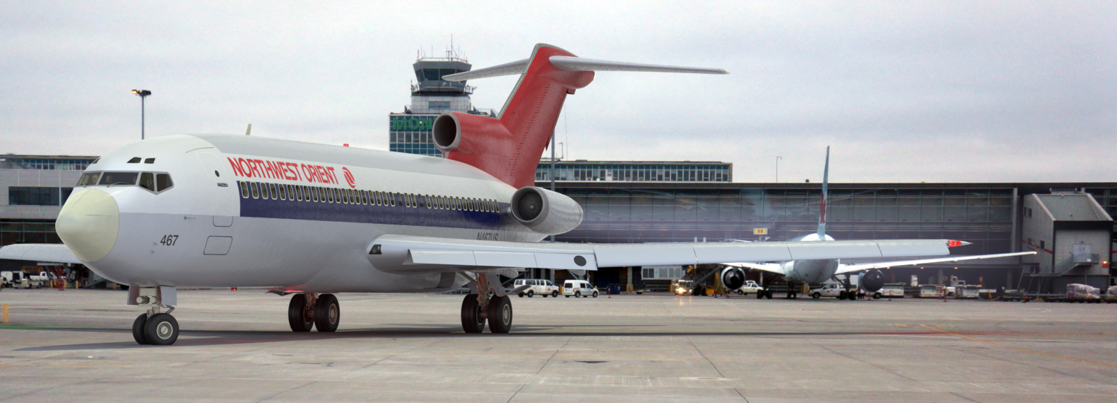 In the movie above, the aircraft is facing approximately north, with the camera doing the moving. The first thing you'll notice is that because the sun is low in the sky, there's a dramatic difference between the lit side and the unlit side. You can see the full range of tones, from a warm orange on the lit side, to a bluer "cold steel" look on the unlit side. It's also obvious, from certain angles, that the aircraft has no passengers. Attention is drawn to this fact by the reflections on the wings, and had to be fixed. Next, I noticed that the separate pieces of the center engine fairing were showing, due to some material changes that happened when I added the Northwest color scheme. (Later, I changed this seam to a vertical one, as on the actual aircraft.) The landing lights, at the wing's roots, need to be aimed lower, and slightly outward, and were corrected. During the project, I kept a running "changes list" of details like that, noticed in various tests, and fixed them one by one.
