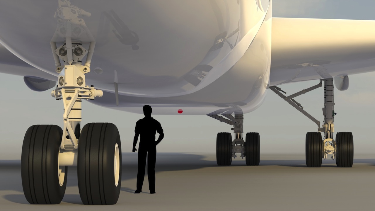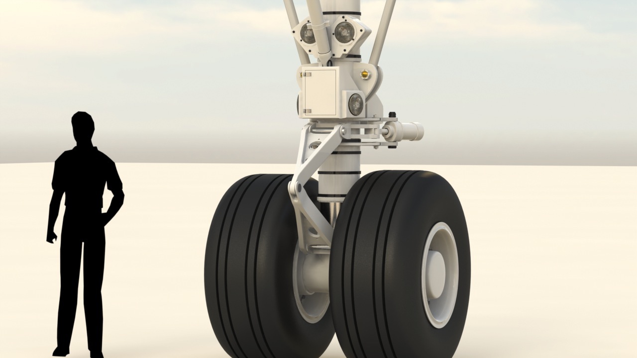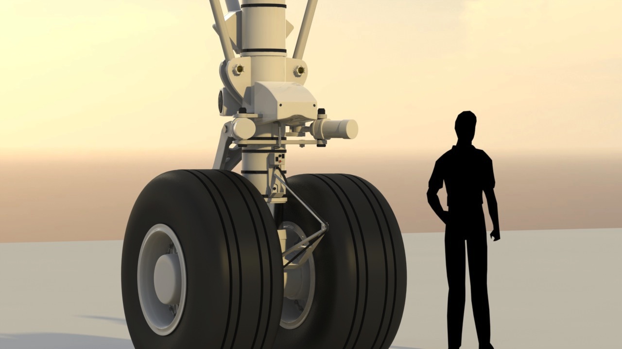 Below, front and rear renders of all of the landing gear at once. (The nose gear is slightly off the ground, because my reference drawing shows the aircraft level… It actually sits slightly nose-down when on the ground, which I'll adjust after everything else is done.)