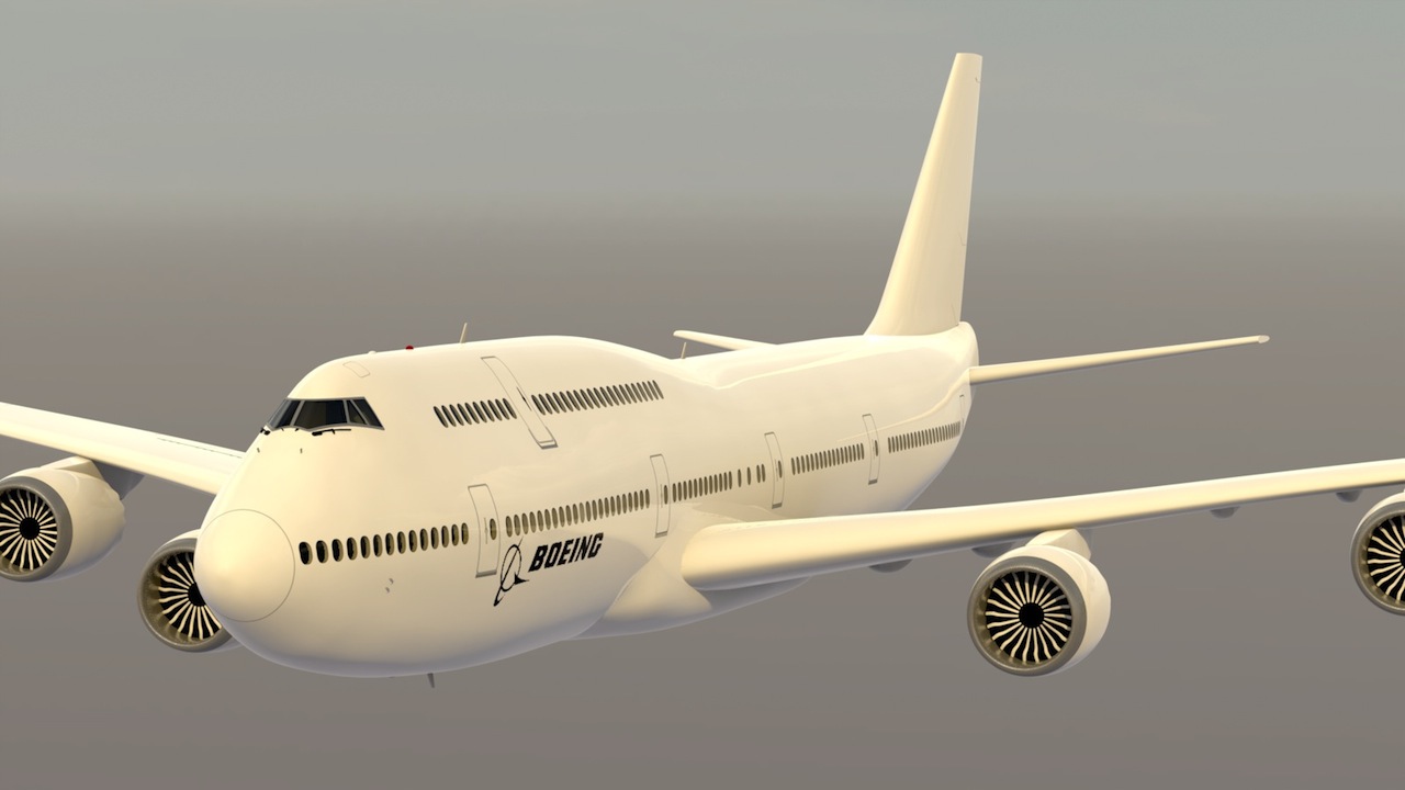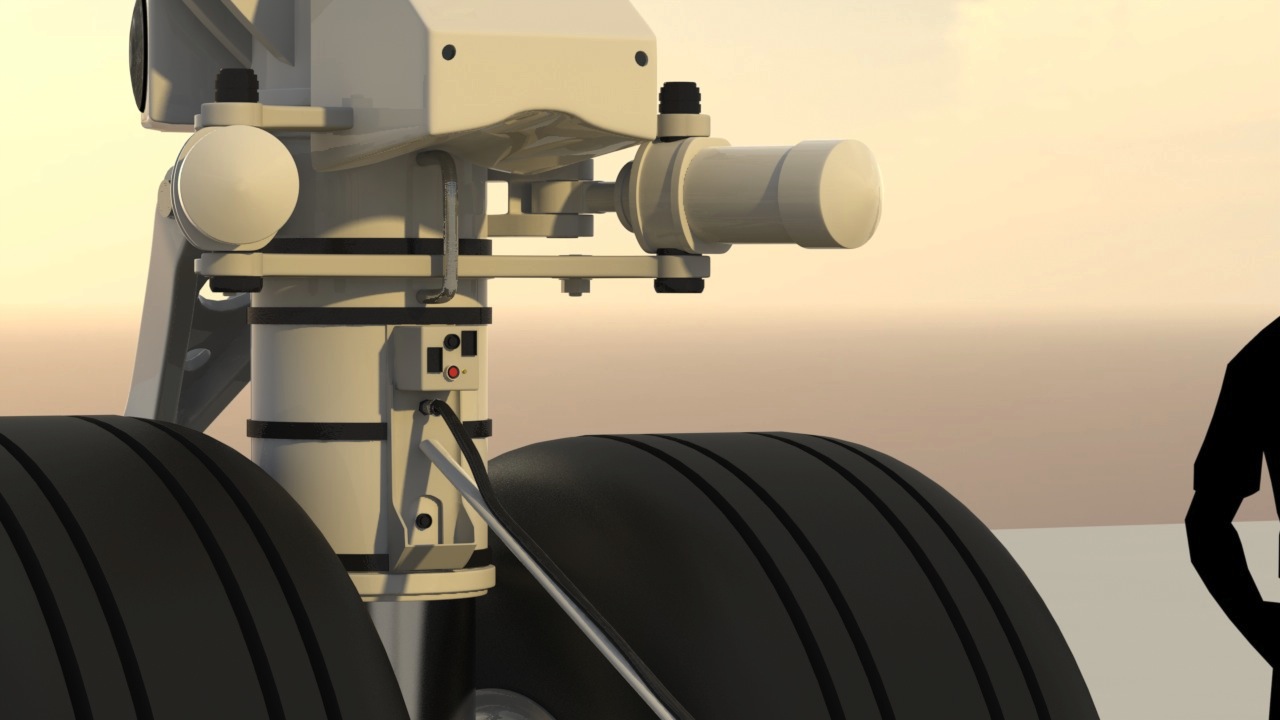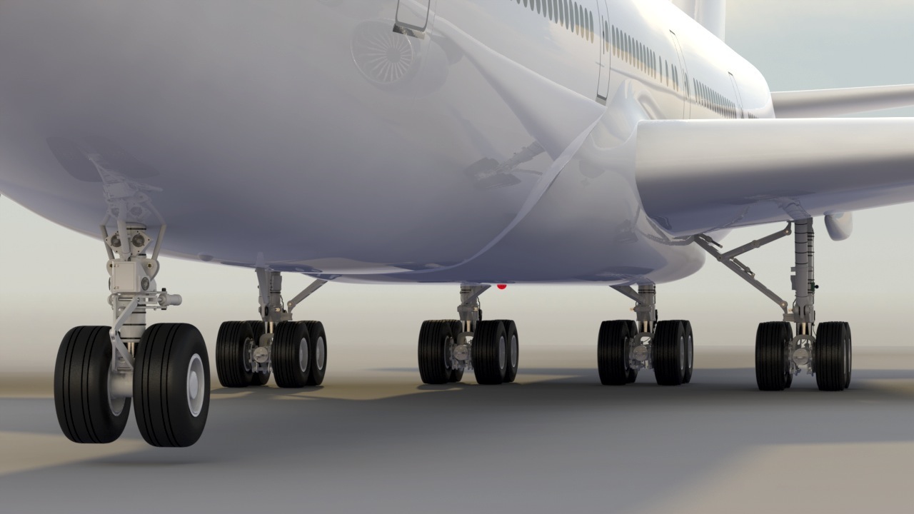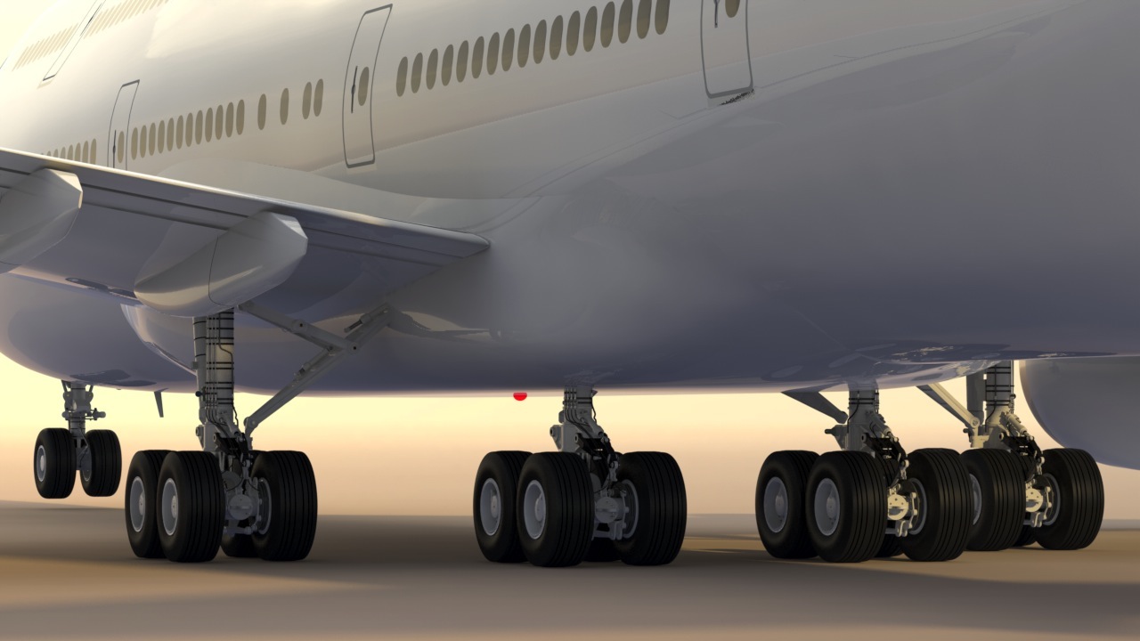 Below, front and rear renders of all of the landing gear at once. (The nose gear is slightly off the ground, because my reference drawing shows the aircraft level… It actually sits slightly nose-down when on the ground, which I'll adjust after everything else is done.)