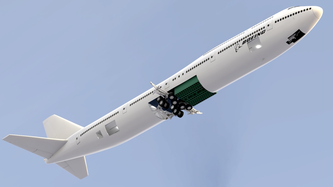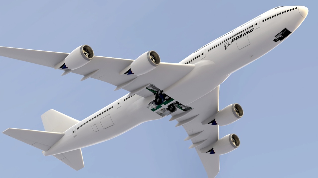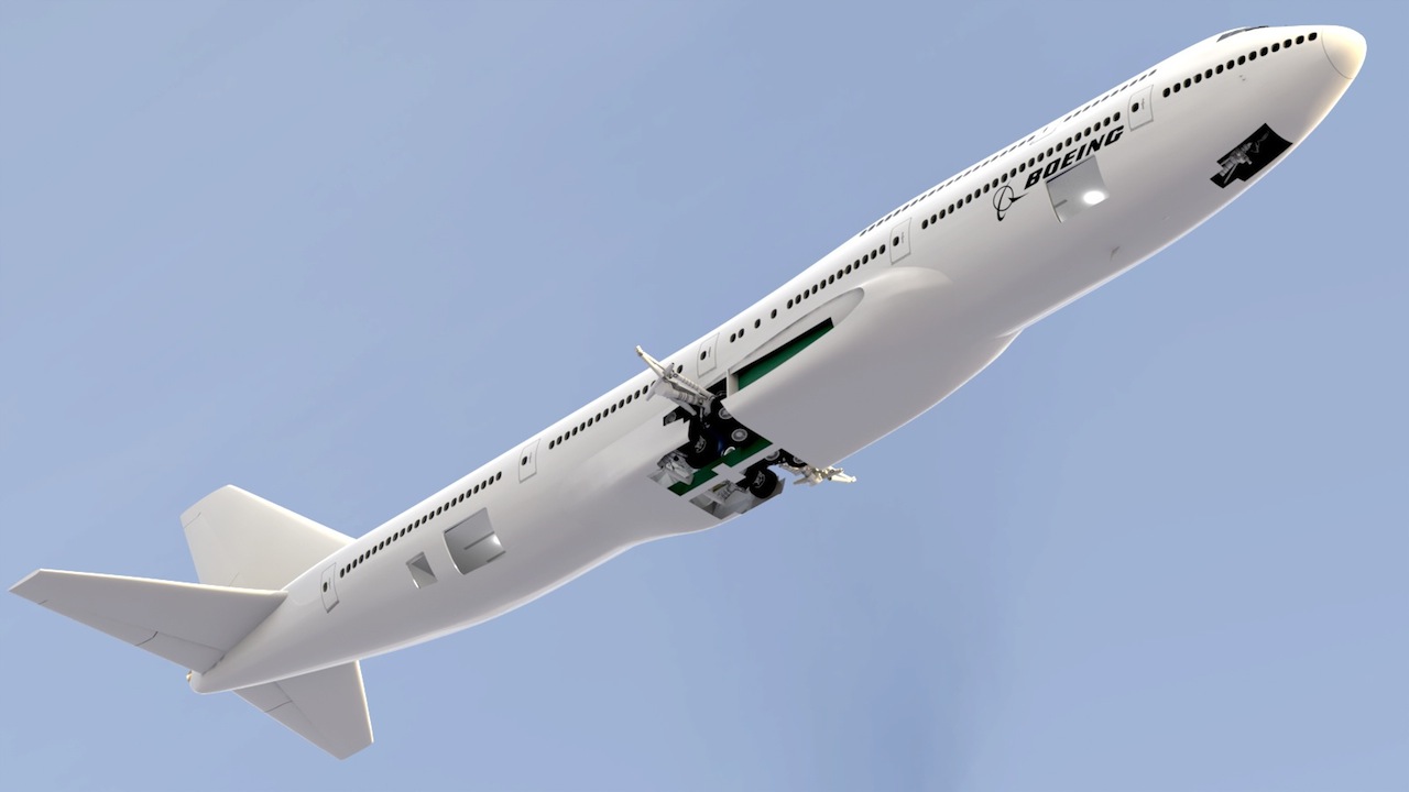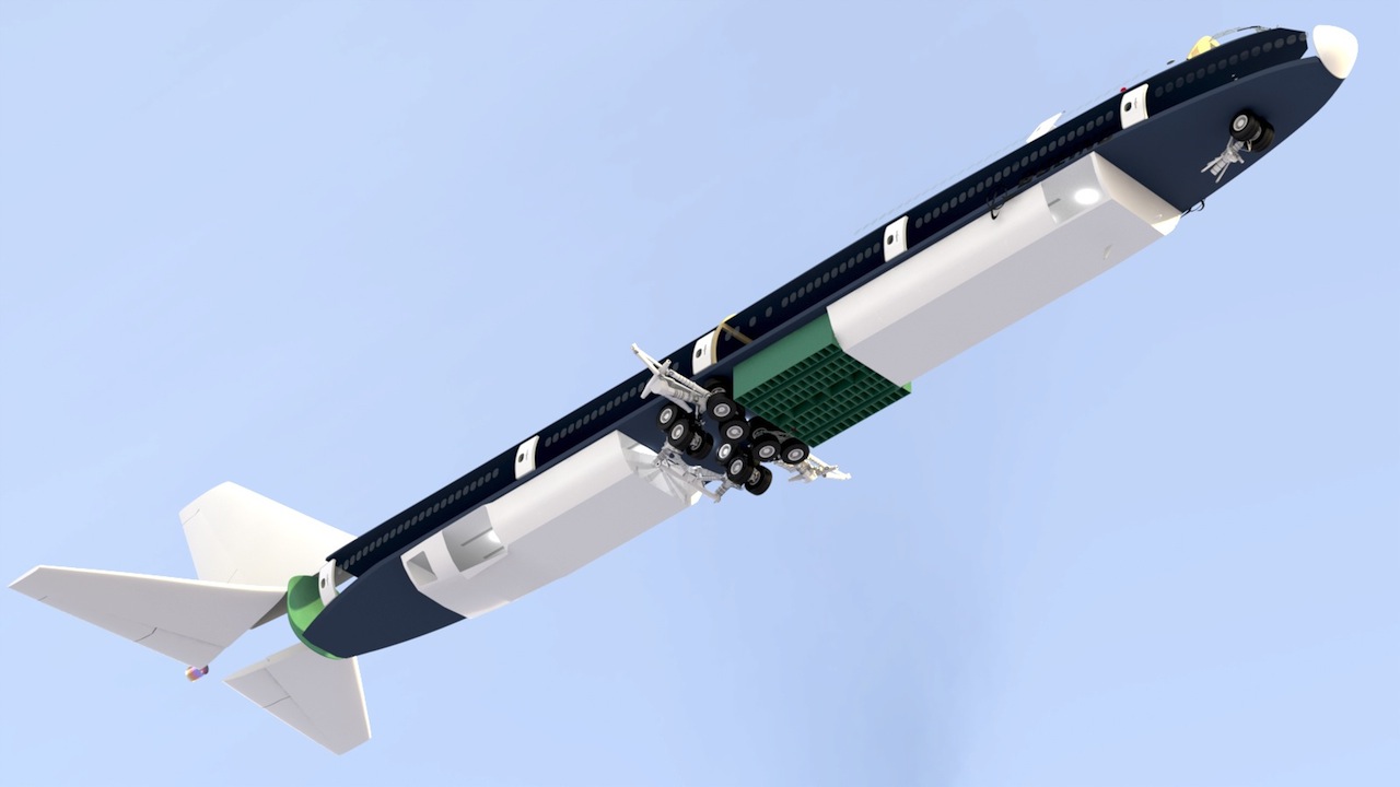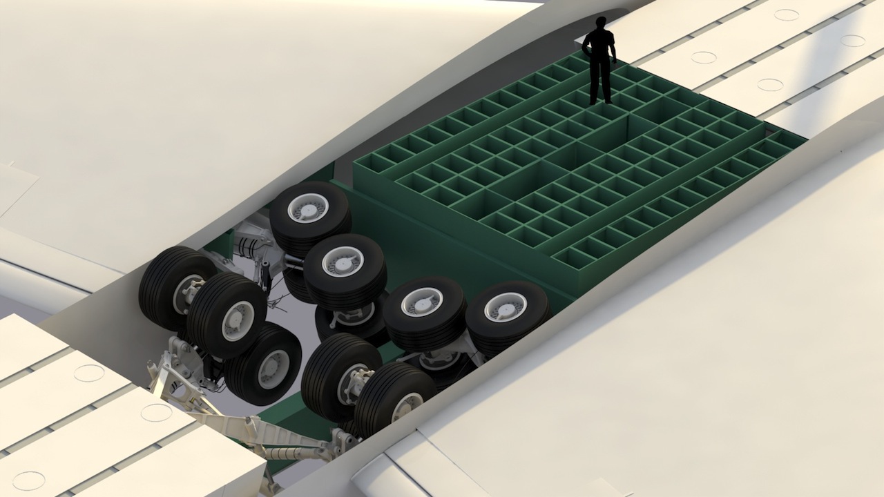 The landing gear stowed, and the cargo bay in place. (One in front of the wing box, and one behind the main gear)
