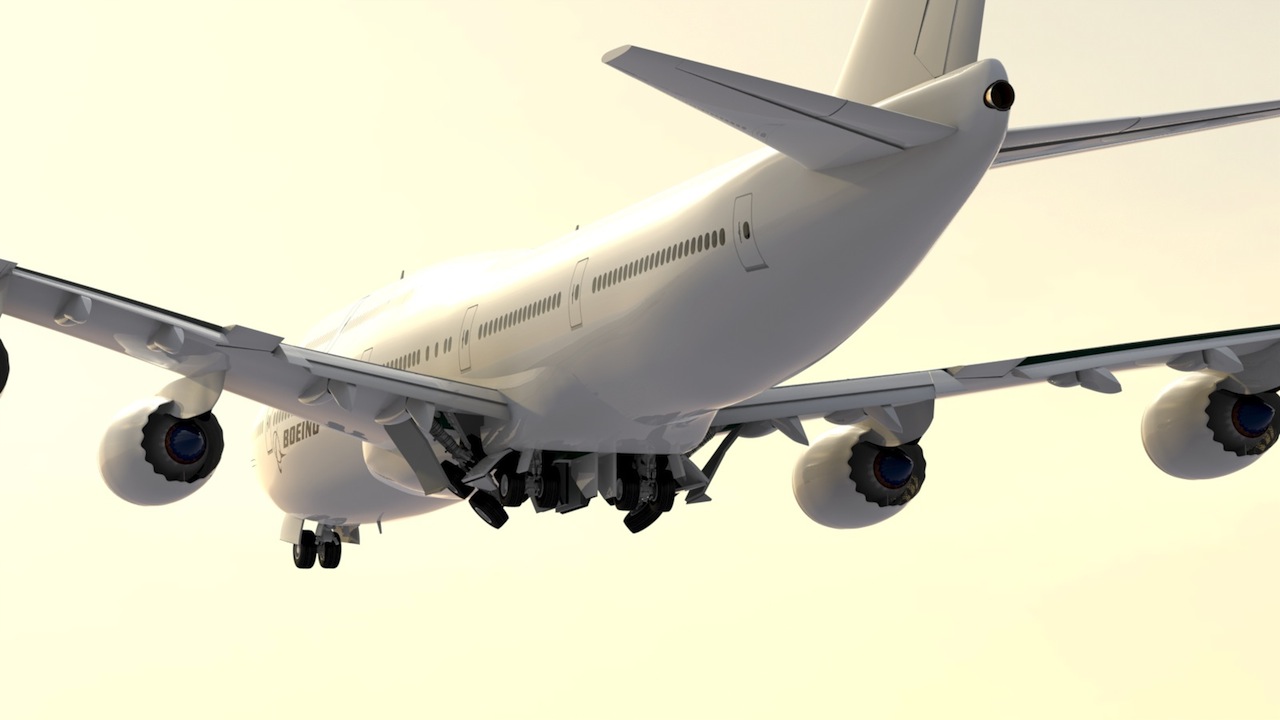 The landing gear rigging had to accommodate several positions, for future animations. (At the bottom of this page, there's a video explaining how I did the rigging on this model.) First, consider takeoff. As the aircraft rotates to a nose-up position, shortly before lifting off, the oleos (shock absorbers) extend, as weight comes off the ground. Also, the landing gear trucks (or "bogies") have to rotate forward, allowing all wheels to remain on the ground. Then, once the aircraft lifts off, the trucks rotate rearward, to allow them to fit into the gear bays. Some of these positions are shown in the next four images, and the rest are in the video just below that.
