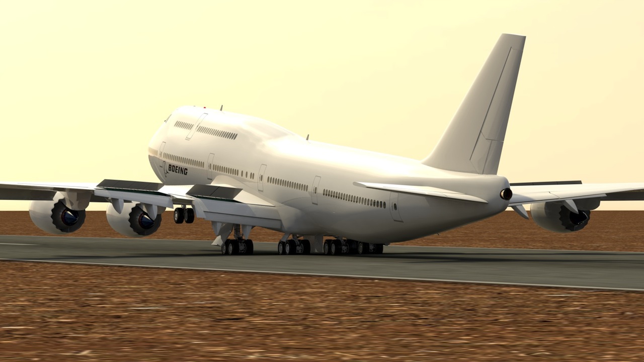 The next two images show the sequence for landing. On touchdown, exhaust is coming from the engines normally. Then, as the reversers open, the rearward exhaust is reduced a little, and the speed brakes (spoilers) open. All eighteen of the tires are now rolling realistically, too, thanks to MODO's "revolve" modifier.