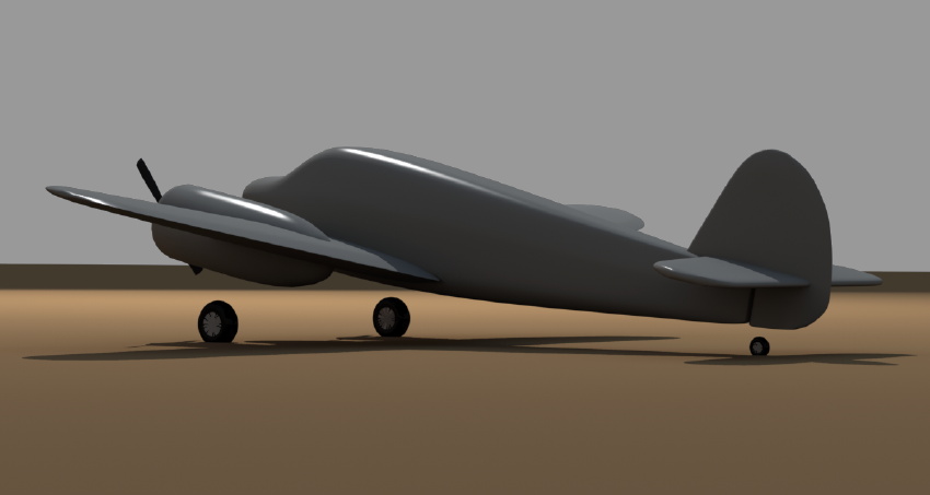 The fuselage, wings, tail parts, and engine nacelles are sub-d surfaces, and the small parts, including the props, spinners, and landing gear are straight polygons. (This may change later.) At this time, the shape is just roughed-out, to get started. I'm aware that the shape of the props should be round at the tips, and that the nose shape isn't right yet, since the windows haven't been added. It's a typical approach for me... Create some "stand-in" parts, then refine as I go. Here are the first few renderings of what I have so far.