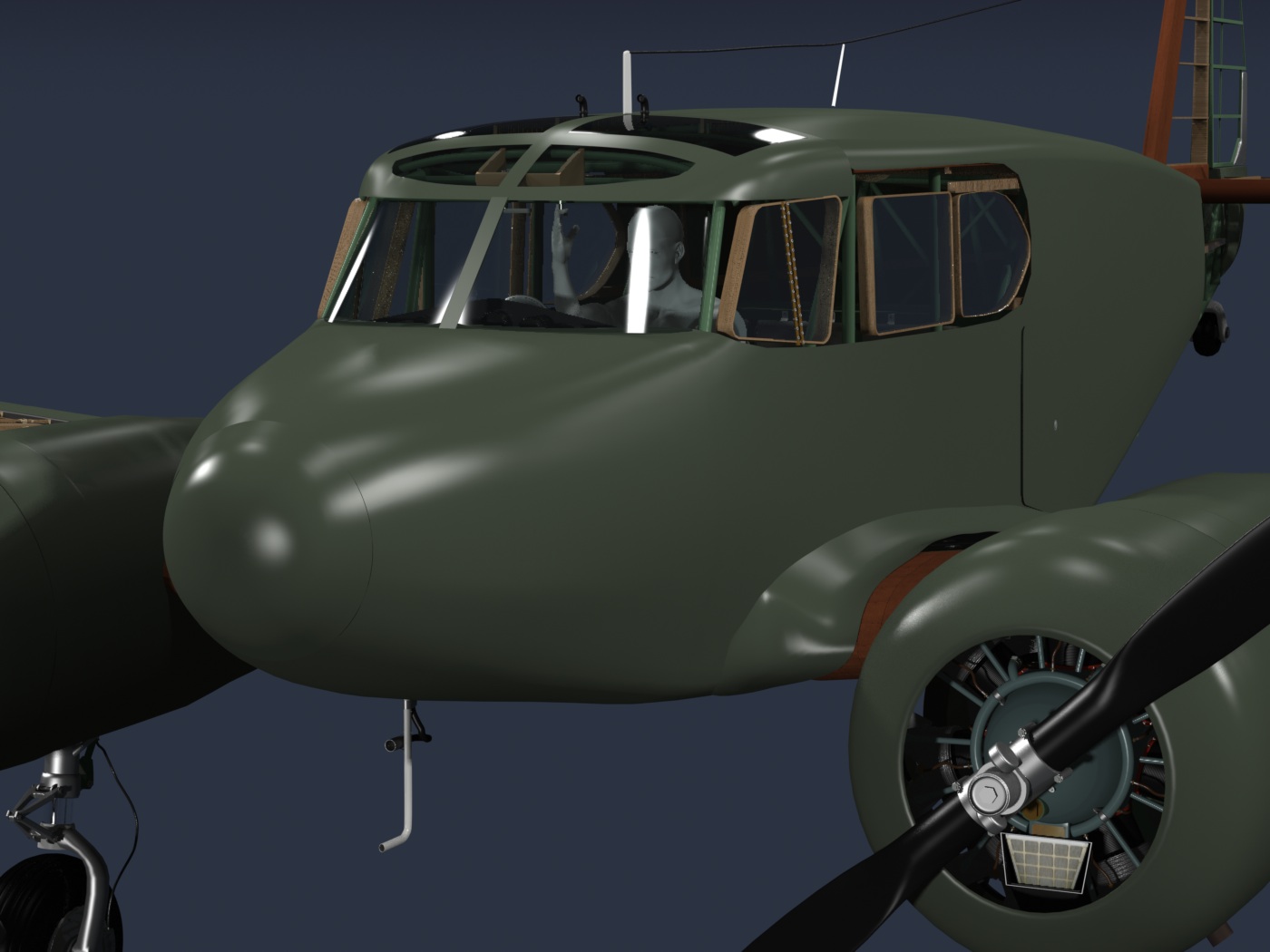 I discarded the original exterior skin I made for this aircraft, long ago. The reason is that I hadn't done the interior structure yet, and found that the exterior I started with, although generally "acceptable", was far from scale. So, now that the internal parts are very close to correct, it seems like a good time to begin on the skin. I used existing vertices in the wood structure to create edges for "patches" of skin, then connected them as I worked, resulting in what you see here, which is nearly a one-piece skin. For now, my concern is the overall shape and fit. Later, I'll definitely add the fabric "sag" to simulate the actual aircraft. There are still some gaps around the cabin windows, and I have not cut out the separate area for the cabin door.