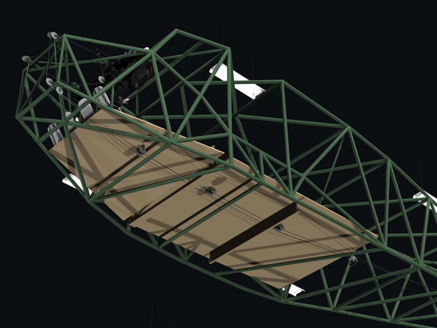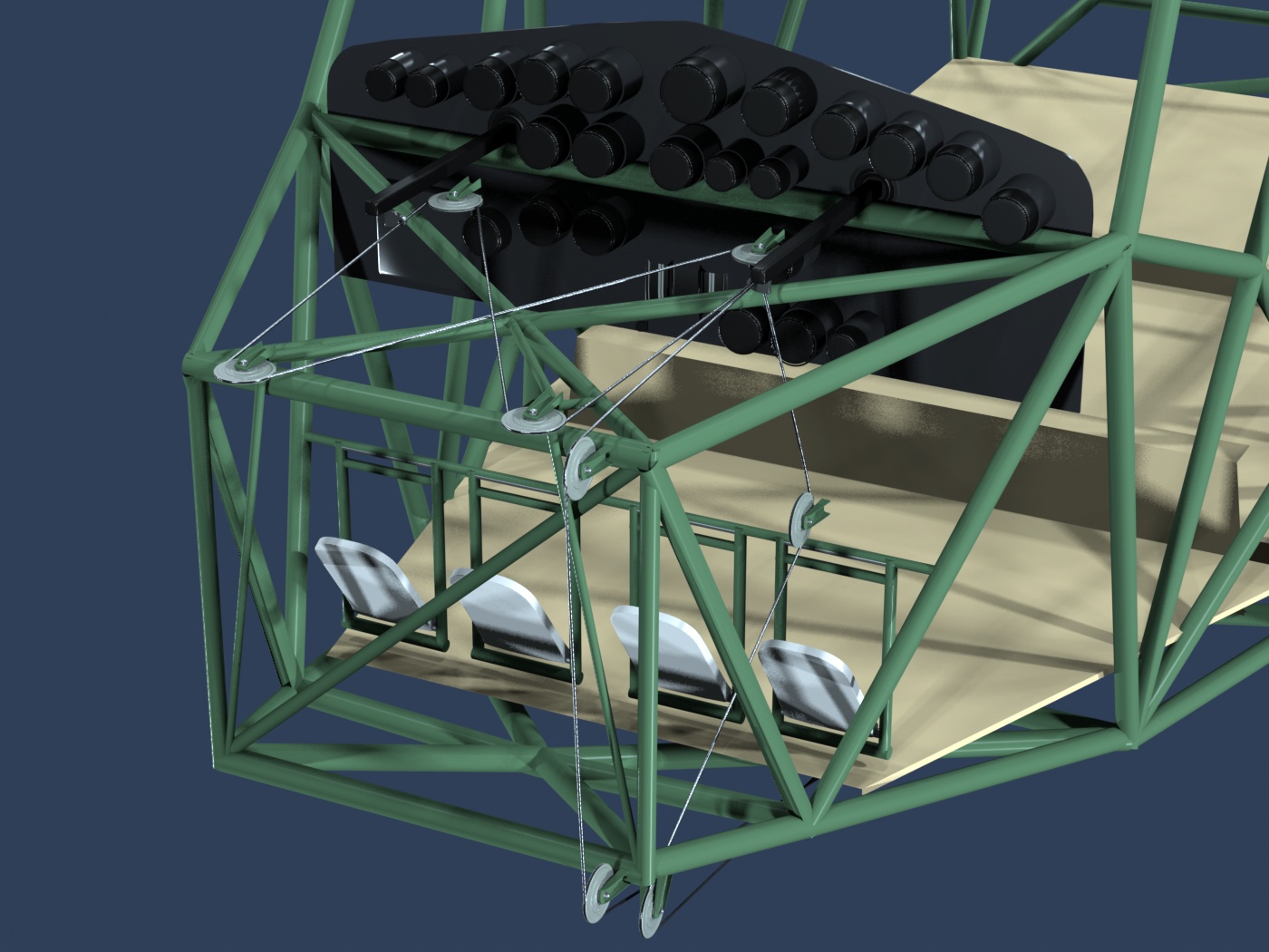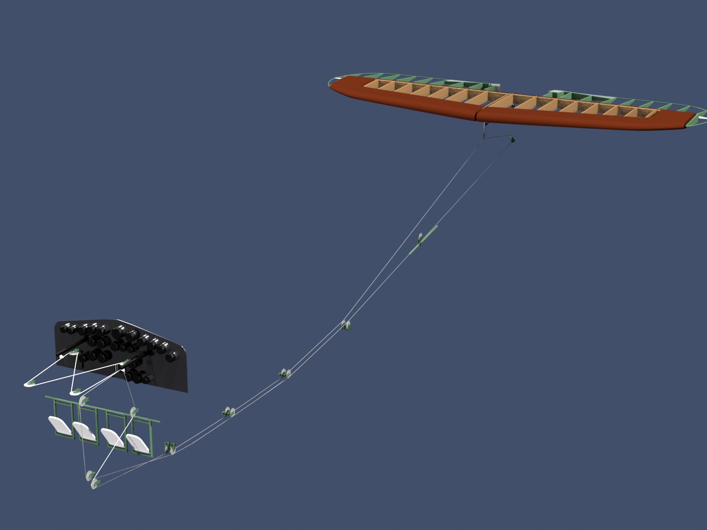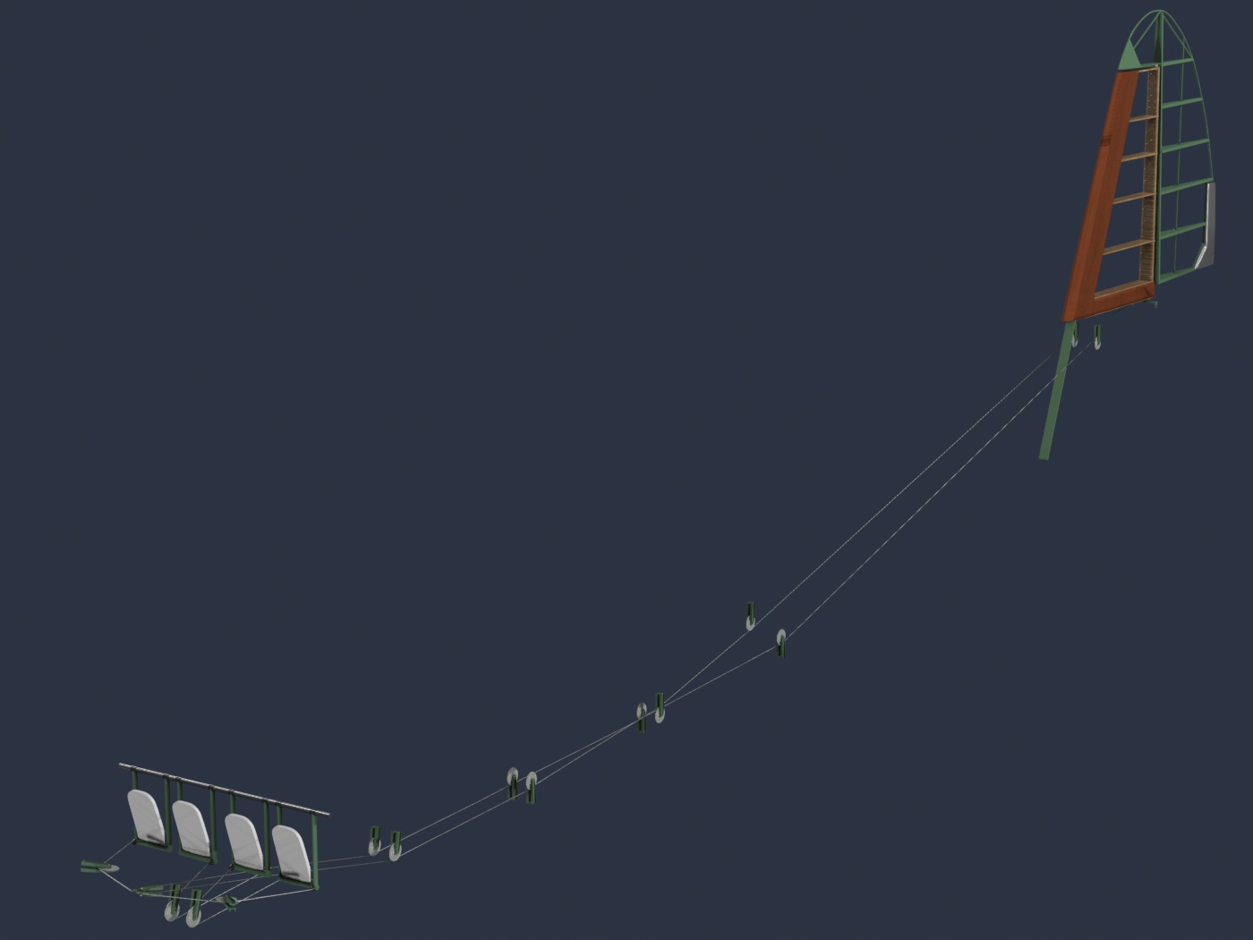 Cables run to and from the tail along mostly-parallel pulleys.