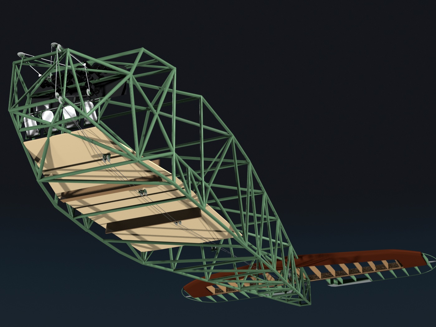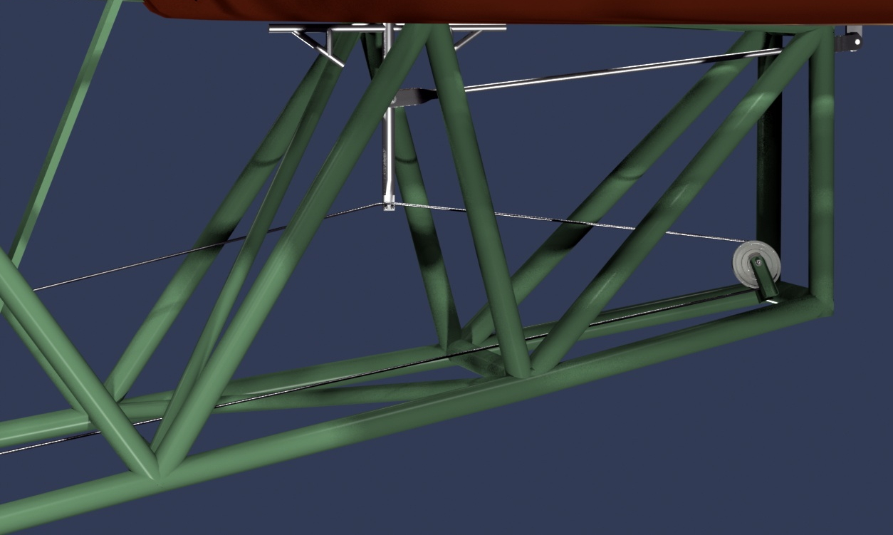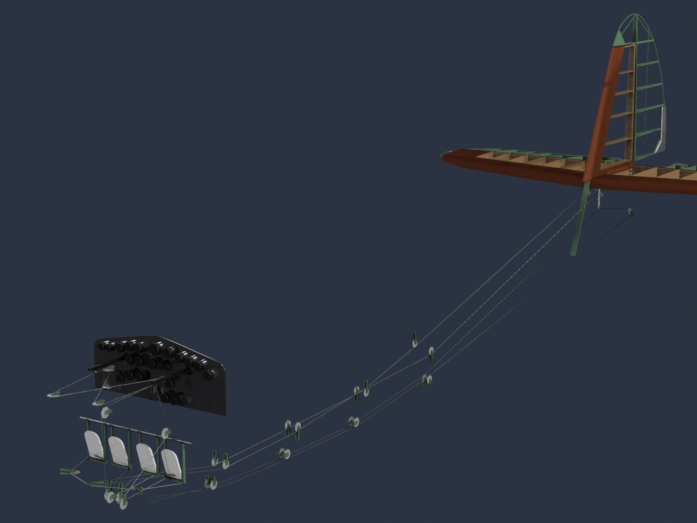 There are a couple of "quirks" in these images... First, ignore the green-colored rod and pulley near the tail. That's part of the RUDDER control system, which I forgot to hide. The other thing is that I was concerned first with the placement of the parts, to avoid interference issues, and some of the pulley brackets haven't been built yet. (So, some are "floating".) I'll fix these things shortly.