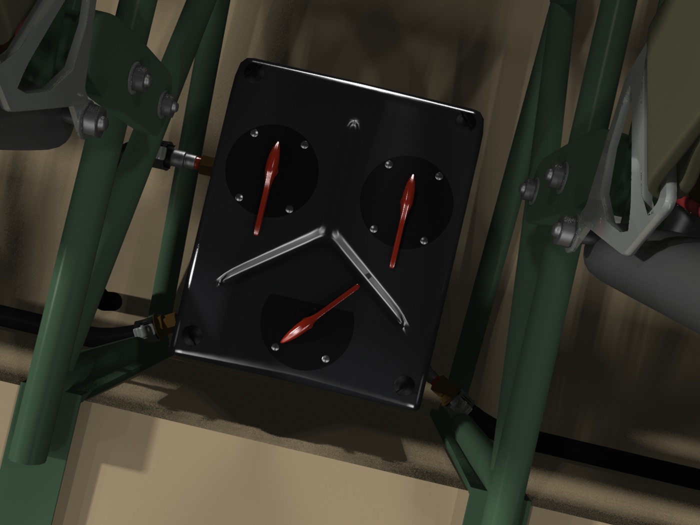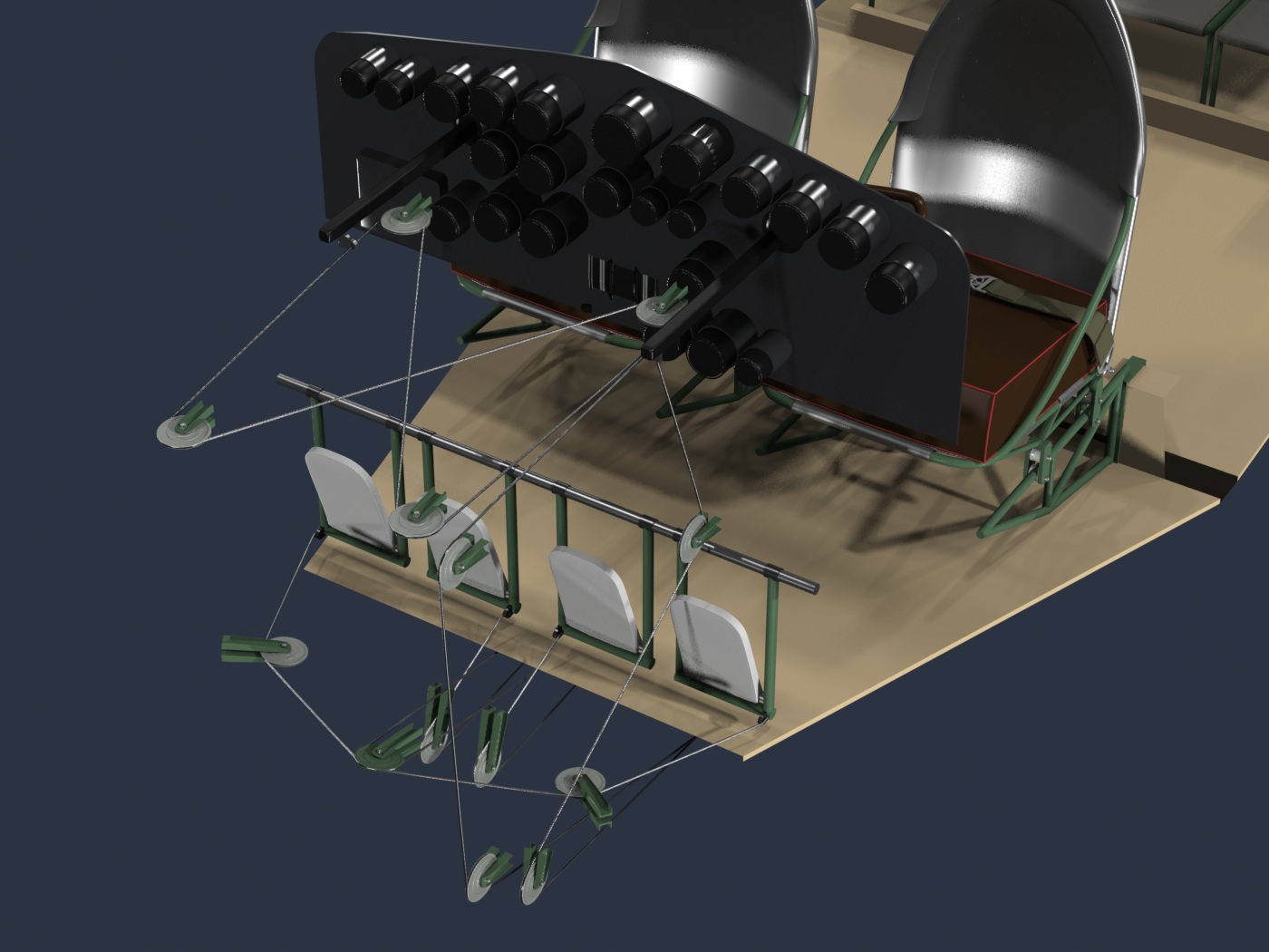Below, a close-up of the cables connections to the cockpit "yokes", as well as the interconnection between them.
