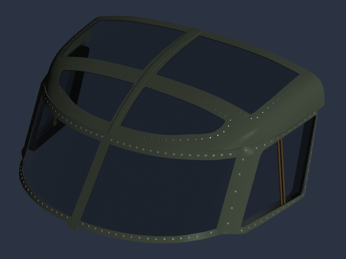 This aircraft has many instances of "frames" or "strips" which cover external seams, such as around the window areas and cowling seams. I'm finishing those up before I finalize the fuselage skin, with the "sag". (Correctly identified as "taunting") I'm also finalizing the interior (fabric) liner, so I've made several see-through renderings, to check the fit.