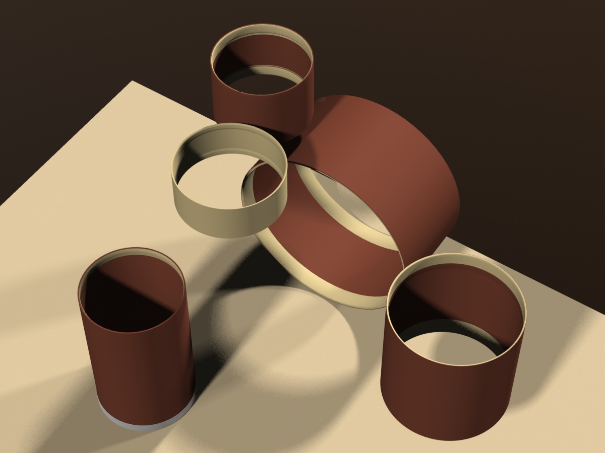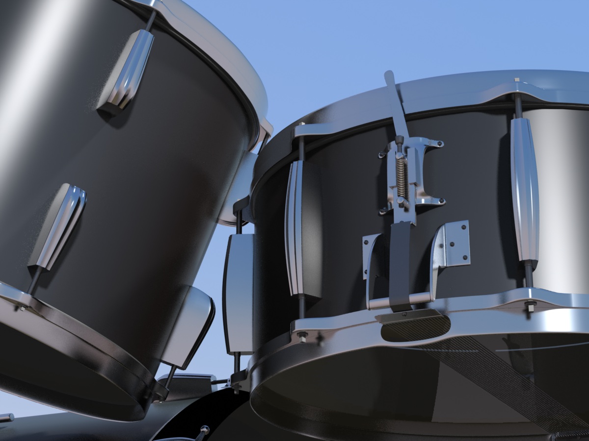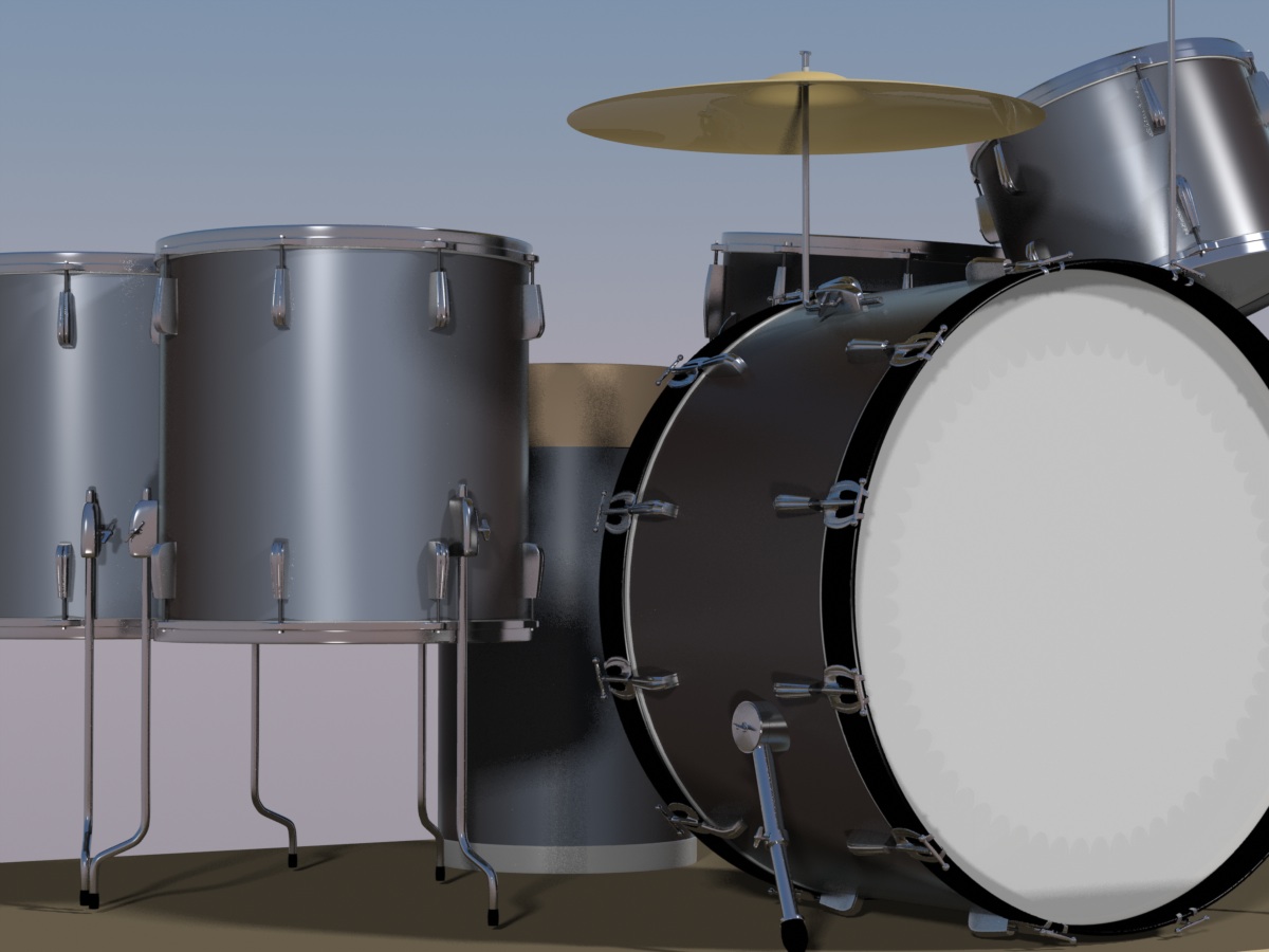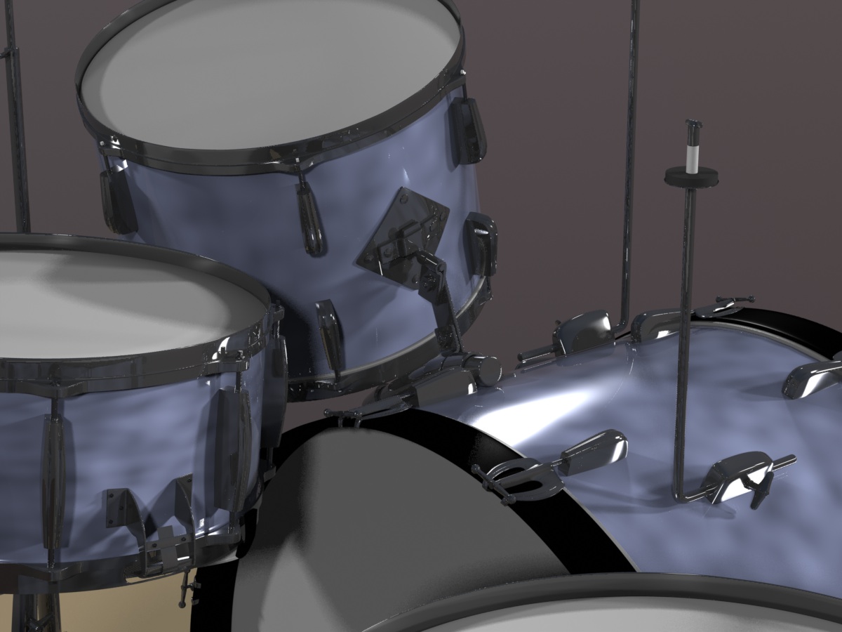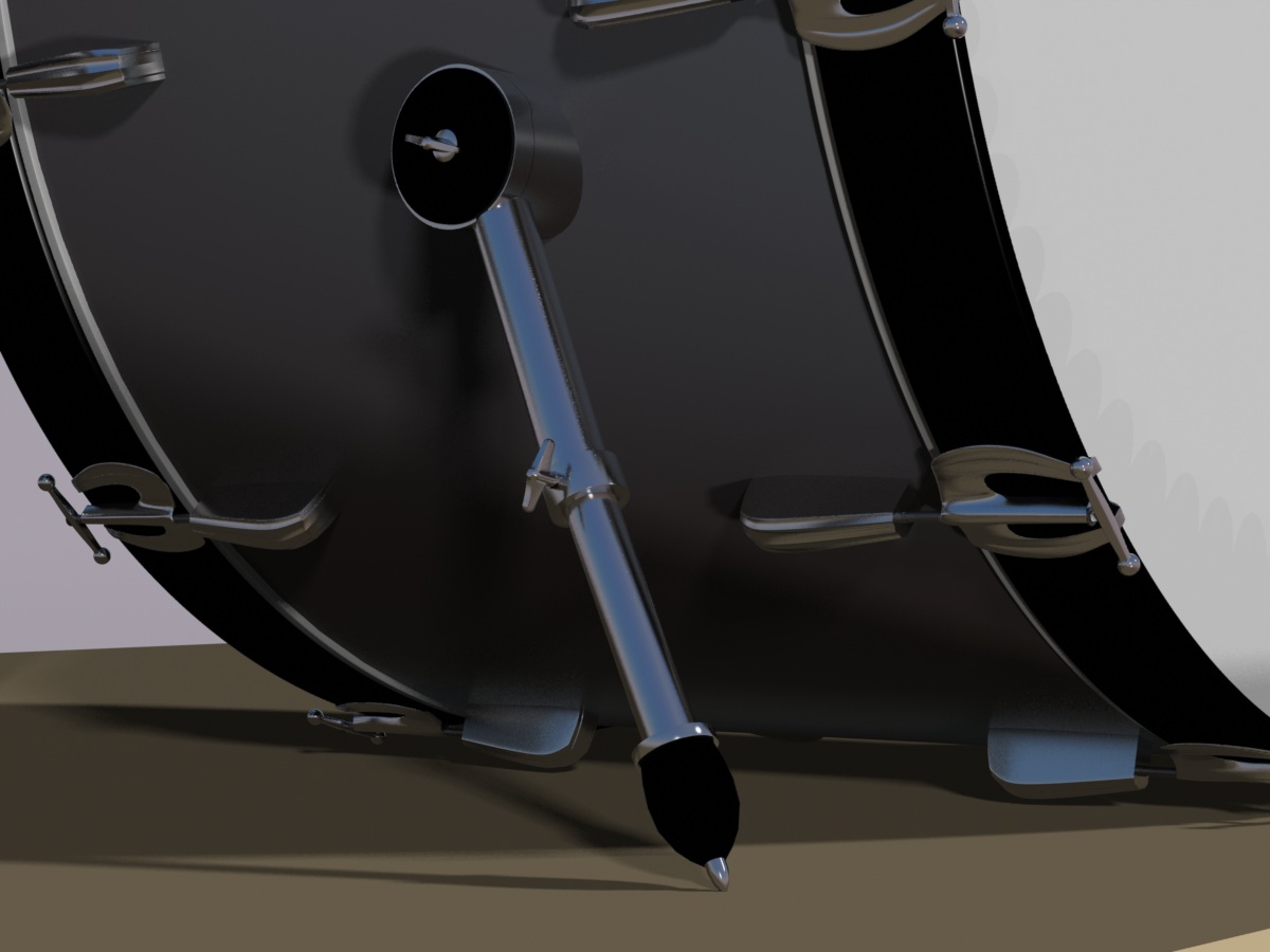 The bass drum in this setup has two "spurs", to prevent it from moving, as well as holders for two cymbals and a small tom tom. The "claws" that hold the front and rear heads on were also modeled as closely as I could, and were a challenge.