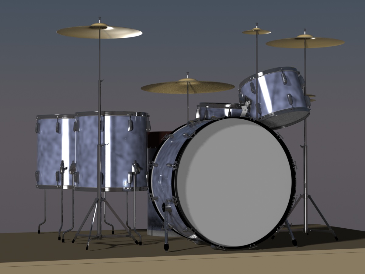 In about 2000, I created a 3D model of the drums in Carrara. Since I'm now using "MODO", it seems like a good time to update and improve the model. For you drummers out there, the sizes are: 14" X 26" bass drum, 9" X 13" mounted tom, (2) 16" X 16" floor toms, 5 1/2" X 14" snare drum. The cymbals are 20" ride, 14" hi-hats, (2) 18" crash cymbals, and 6" splash cymbal. This model is now available in my 3D Catalog.
