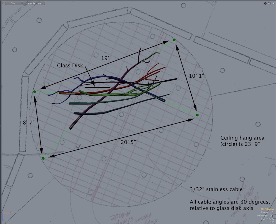 With the 3D model finished, the last step was to use a floor plan of the display area (a bank lobby) and figure out where the hanging cables needed to go. (and to be sure they could go there) Since the model was built to actual scale, we could use scanned architectural drawings as "backdrop" images in MODO. We made several versions, showing where the cables could attach, and finally selected one as the best, which was used as the installation guide.