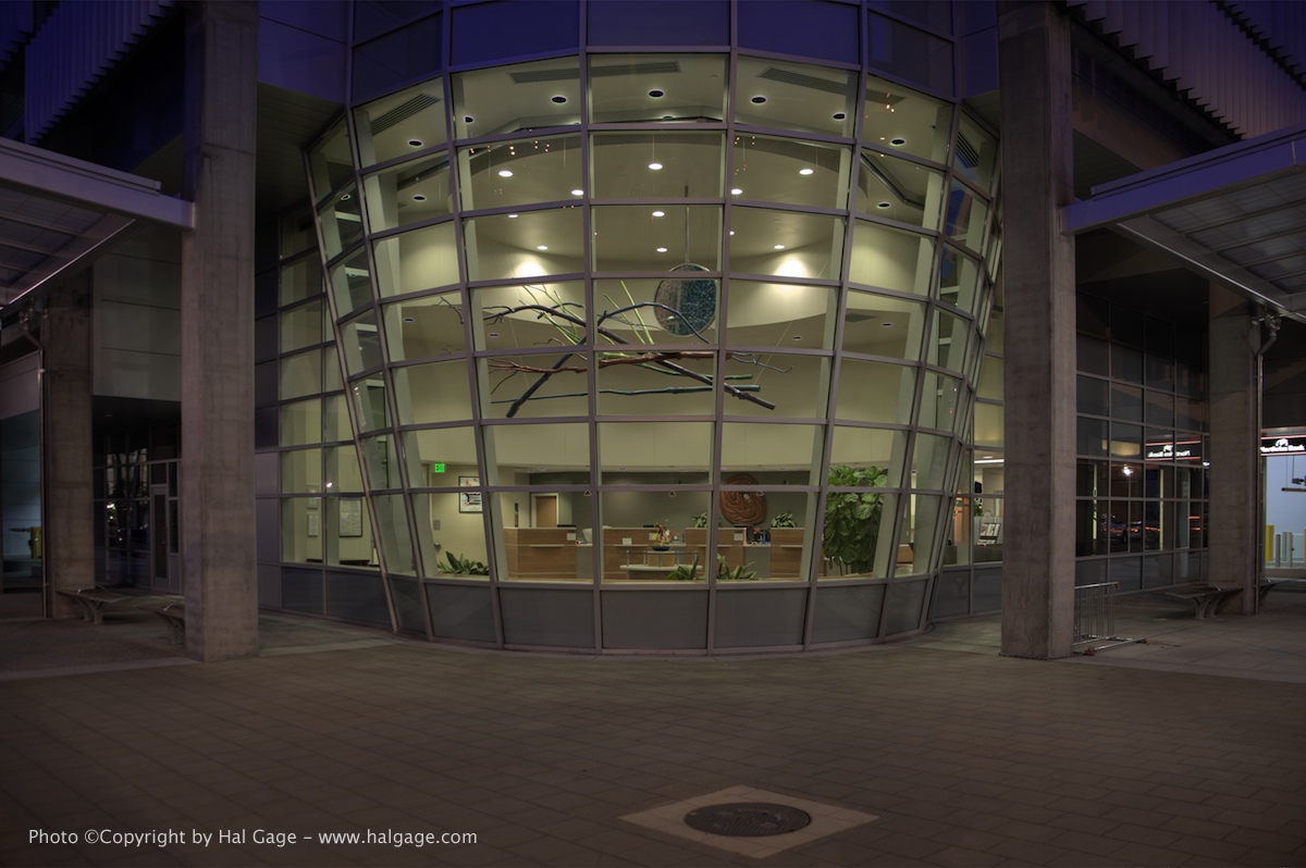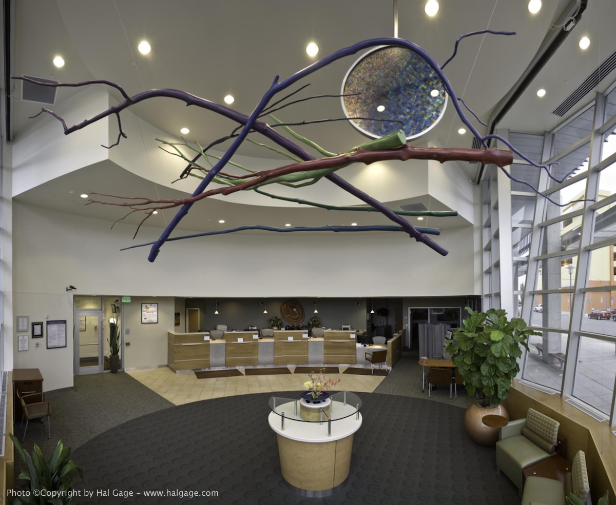 The completed piece and it's installation are gorgeous. It benefits from quite a few natural light sources, as well as ceiling and reflected light, and as predicted, changes form, color, and apparent dimension, as you move around it. All the installation photos below were shot by photographer Hal Gage. If you copy these to your hard drive, you'll find that they're higher resolution than what's shown on this page. (typically, 1600 pixels wide)
