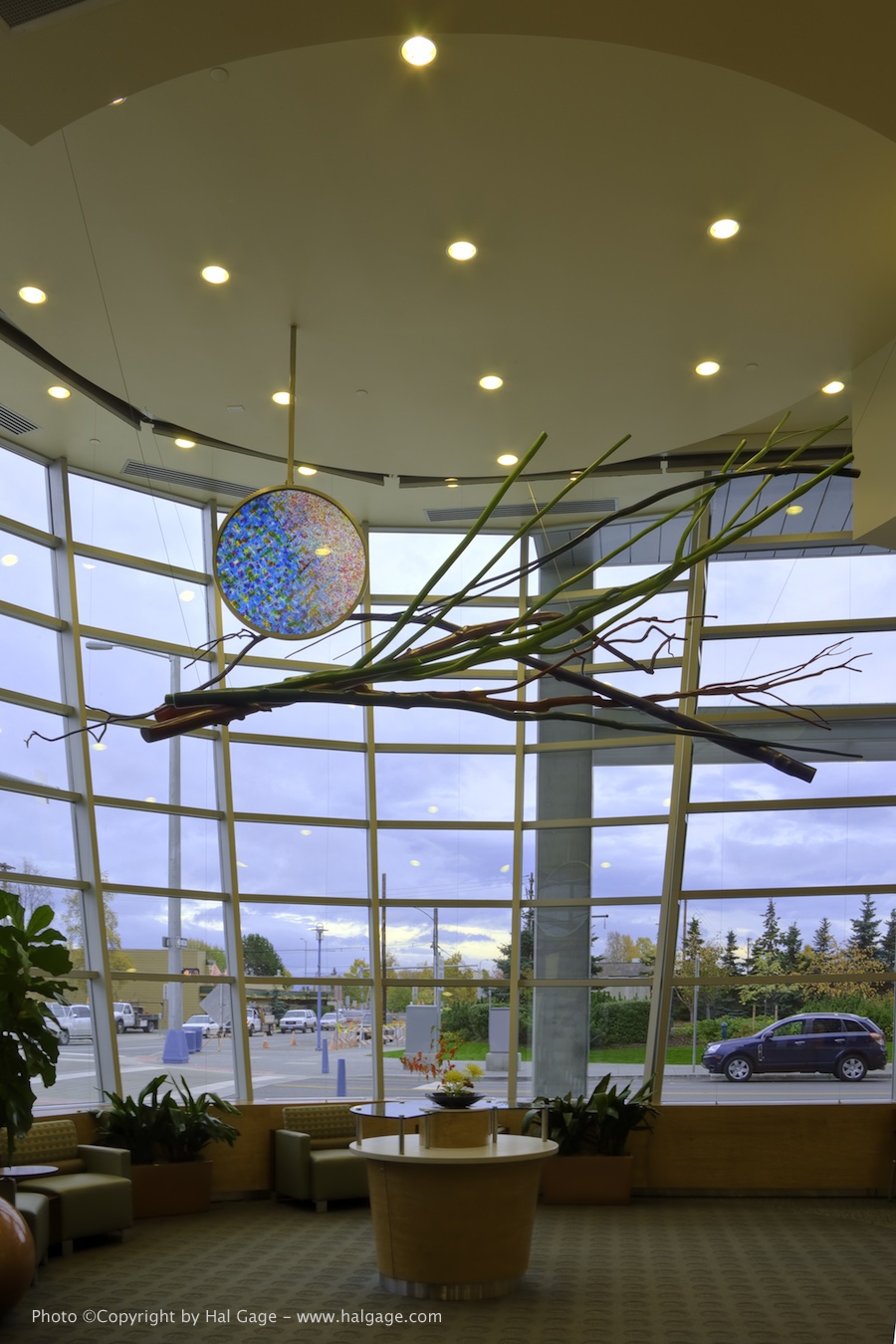 There are times that I do 3D visualization work for other artists. In this case, my job (and my pleasure) was to create a scale model of my amazingly-talented artist friend Sheila Wyne's piece, called "Eclipse". It's a large organic piece, approximately 20 feet wide, 10 feet tall, and ten feet deep, installed in the lobby of the new Northrim Bank, here in Anchorage. It's composed of a variety of actual tree branches, sanded, dried, and stained, along with a 24-inch diameter, multi-layer glass disk. (Details later) This page is as much about remaining flexible for the client, as it is about modeling. It all came together in the end, and I'm pleased to have been part of it.. Thank you, Sheila!