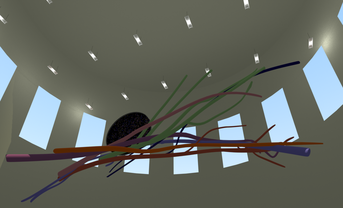 When it looked like we were finished, I did a simple render of the installation, based on the floor plan. This isn't a precision-scale model of the bank, but gives a general idea of how the piece would look from the viewer's perspective.