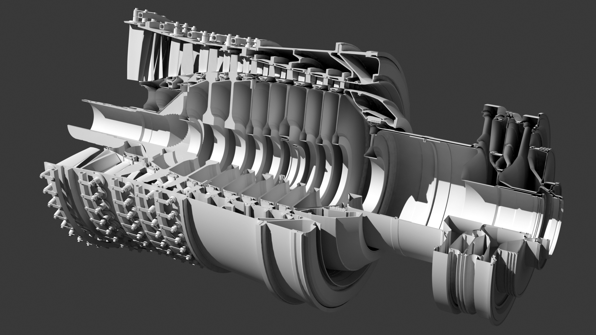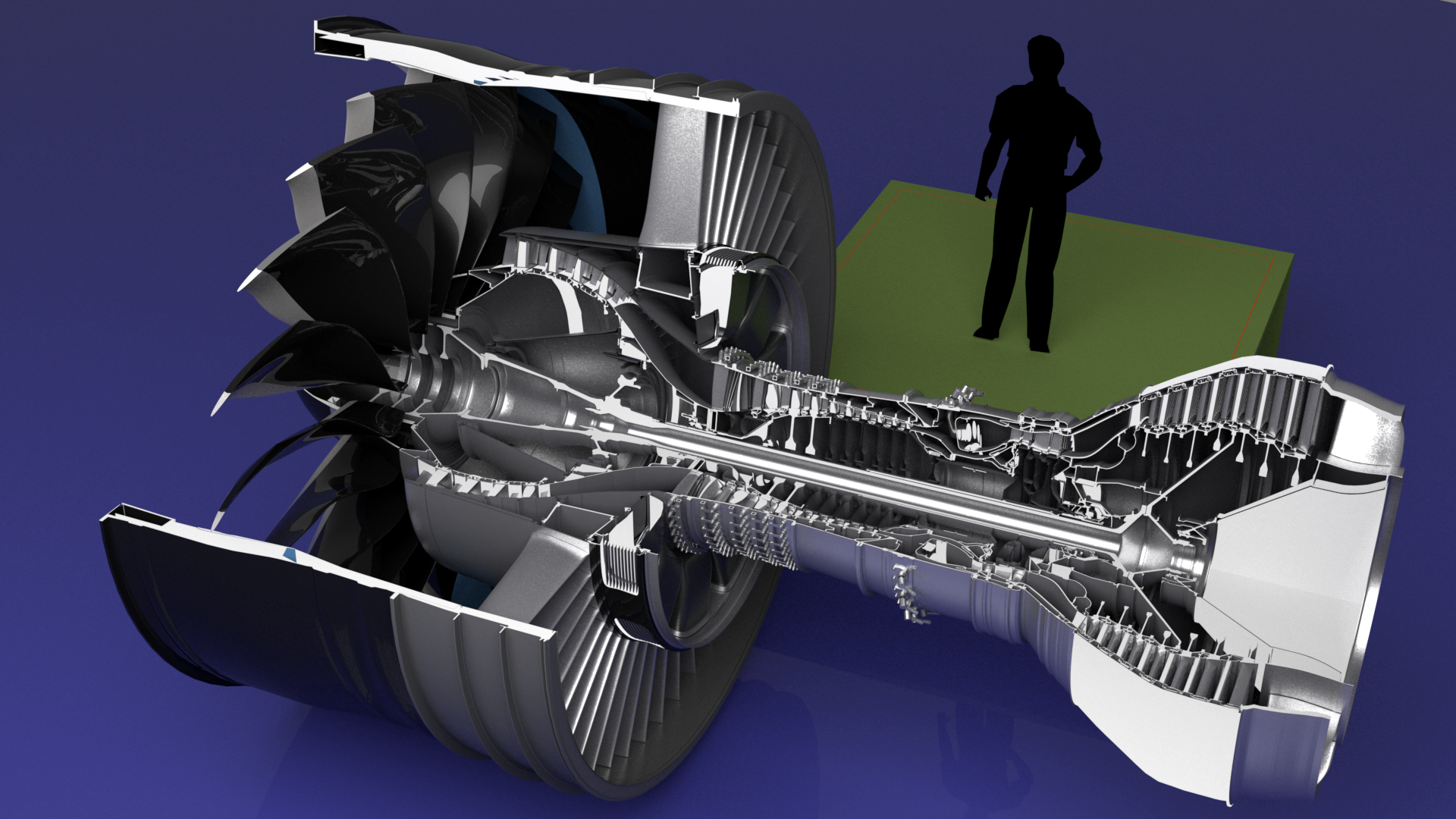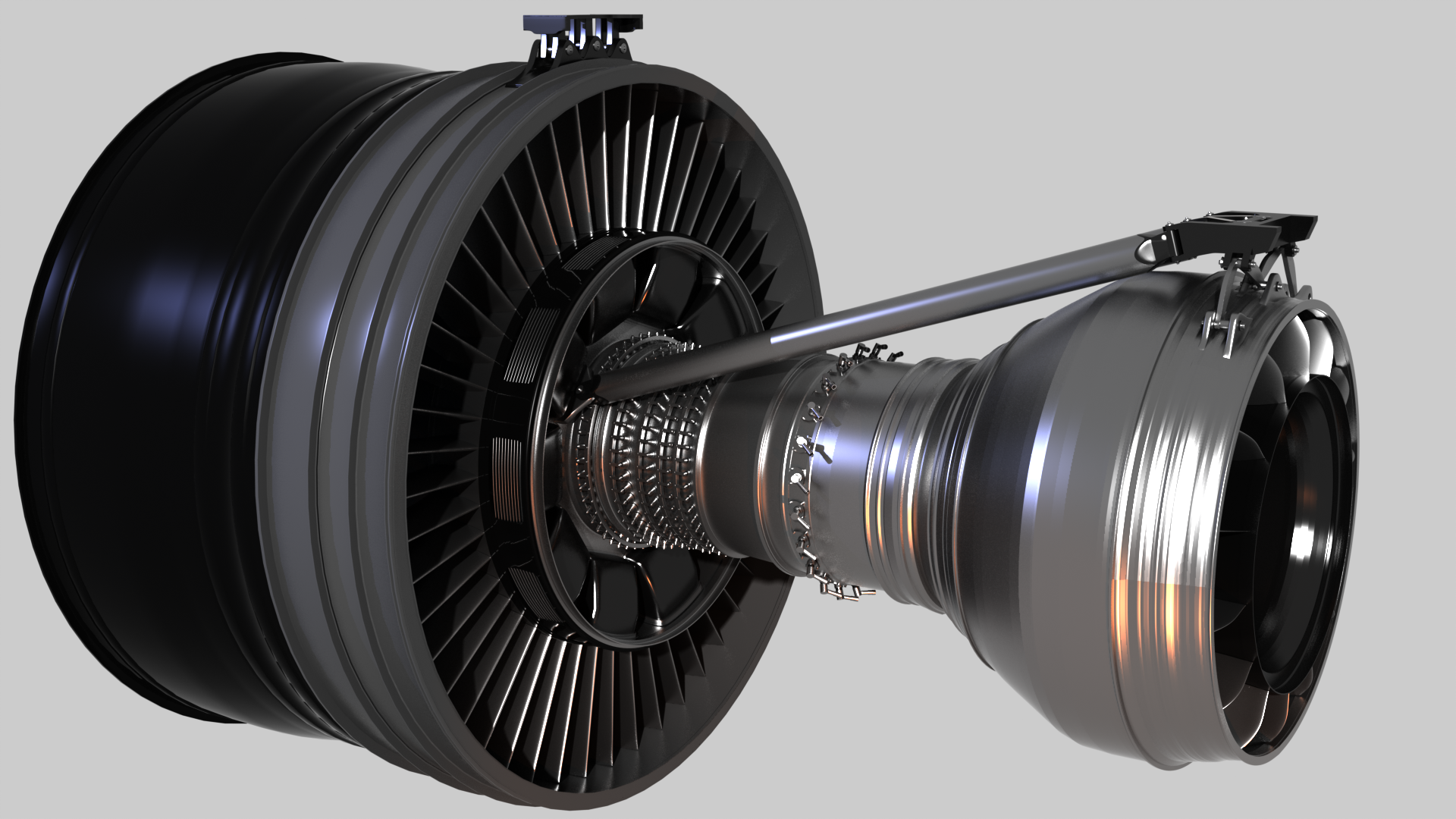 The difficulty in showing any detailed model is that you must get in close, to see the details. So, for example, when you do a cutaway-type render, it's important to consider which parts to cut away. Here are a couple of variations, one which shows the interior all the way down through the drive shaft, and one which lets you see all the fan and stator blades, along with some exterior parts, like the engine mounts. (Remember, you can drag these to your desktop to see them in much higher resolution.) I find myself doing a balancing act with the render times, too. Due to the sheer number of parts, and the fact that they contain a lot of metal materials means that renders like these can take several hours each. I'll need a much more powerful computer to do the animation this model was designed for.