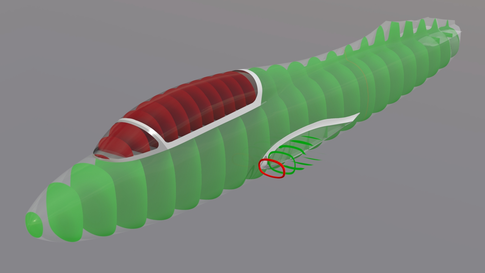 A render of all the formers, with a transparent version of the fuselage skin over them