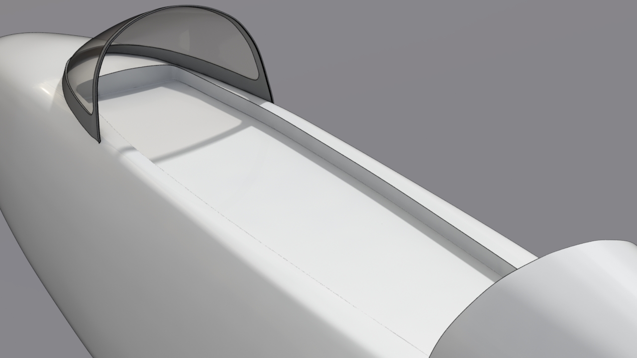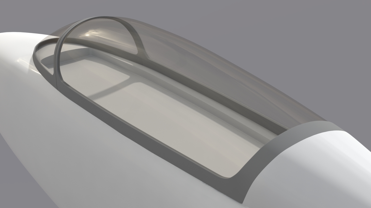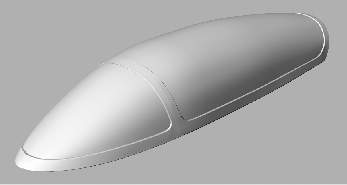 Below, here's the result, showing the IGES file, rendered in Rhino. I've left a tiny edge visible between the forward and aft canopy frame sections, to indicate a cutting line, which the fabricator can use, once the part is molded.