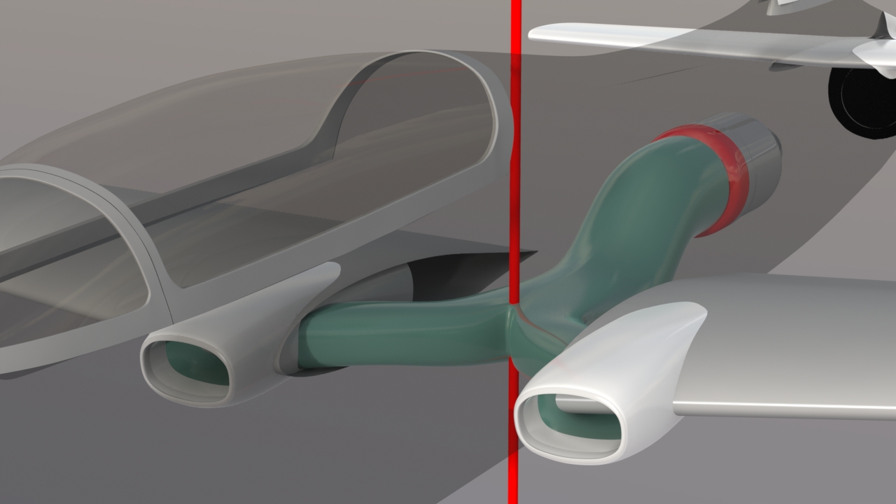 The vertical red cylinder in the image below represents the location of this aircraft's center of gravity. Since the fuel tank would ideally be located there, we modified the turbine ducts to maximize the space around the tank, by moving the ducts toward the bottom of the fuselage.