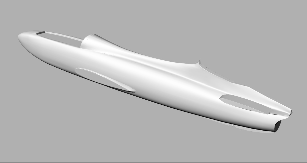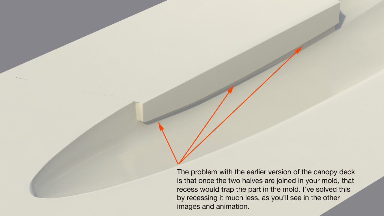 Years ago, I used to build a lot of plugs and molds. (See my archive site at NextCraft.com) That experience helped me recognize that although what I had modeled in the cockpit area was fine visually, it wouldn't work properly in a left/right molding procedure. I constructed a mold proxy to point this out to the customer, and also pointed out why it's important to have a couple of openings in the mold halves, to provide the ability to seal the seam, during fabrication. In this case, those openings were in the cockpit area, and the exhaust area of the tail.
