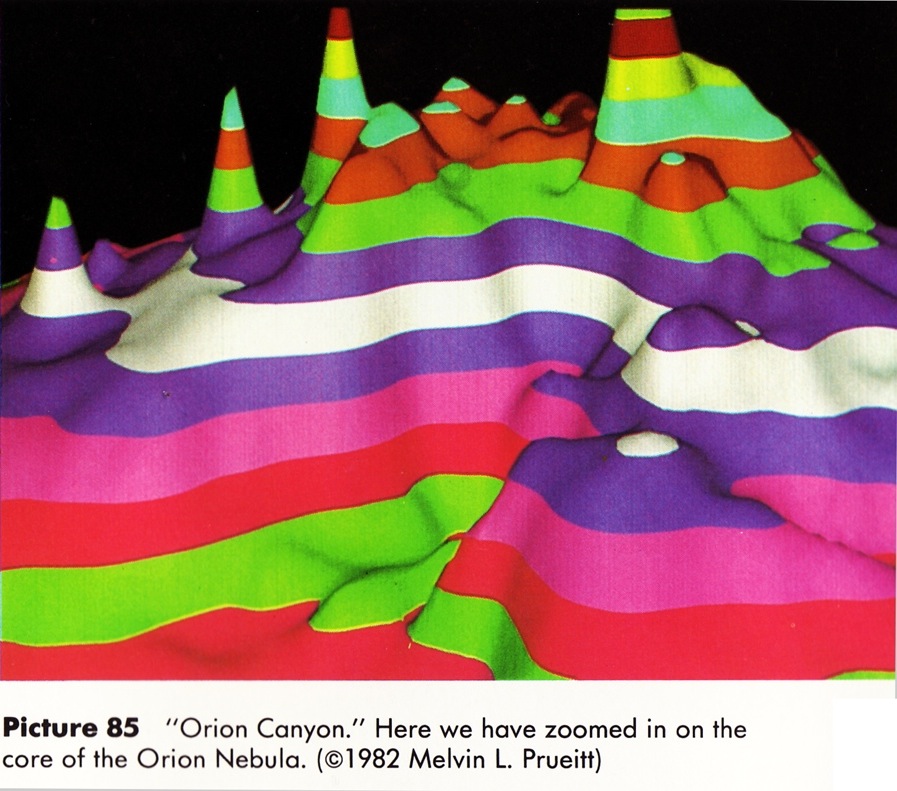 Ultimately, I came to have a basic understanding of the various math functions, and also the "scaling factors" used in the programs, which converted the 2D formulas into 3D graphics with the illusion of perspective. During that process, I created a catalog of formulas that created individual shapes, which I simply thought of as "mountains", "valleys", "craters", etc..