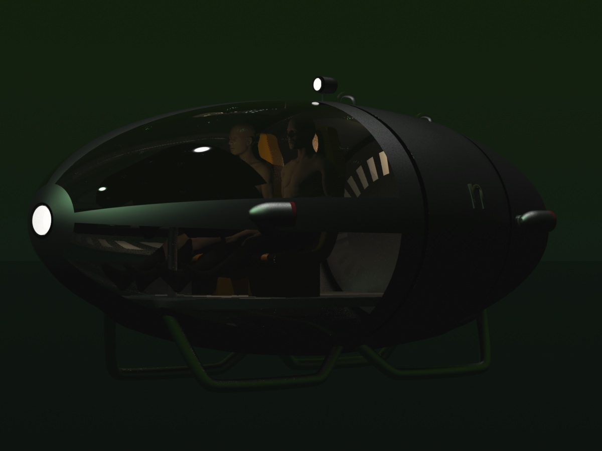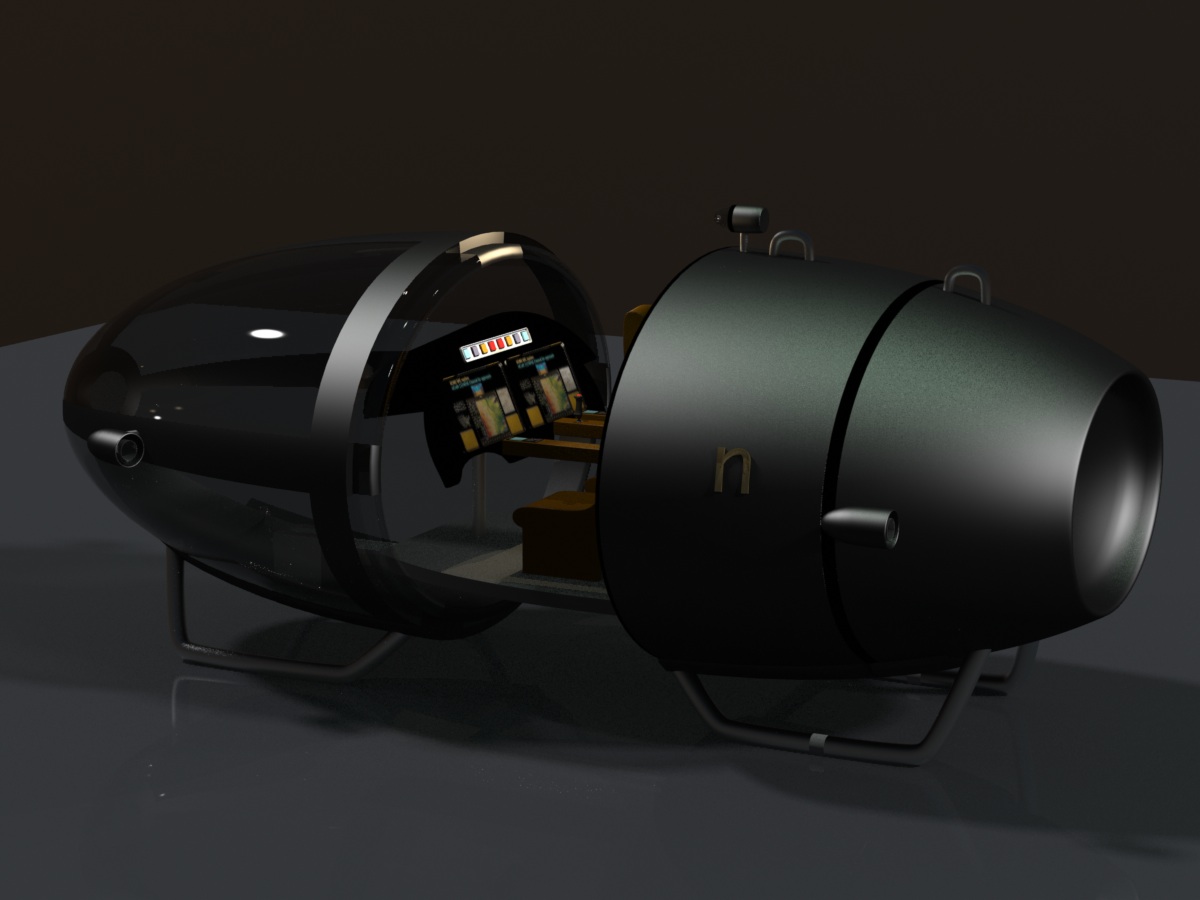 A two-person, fast, deep-diving submersible, for fun or research. The nose section slides forward 4 feet, to allow easy crew entry and resupply, on the surface. Power is provided by a large thruster in the aft section, and fine trim and hover control is via 4 side-mounted waterjet thrusters.