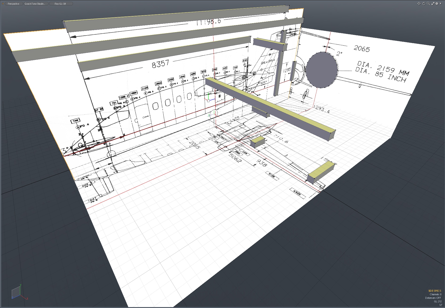 Until this model is finished, I'll be keeping some of my previous model's parts in the same file, for reference, and for use in some renders. But, this model is completely new, and every part will be replaced, as the project continues. So, once again, I carefully checked all of my documentation and it's placement in MODO, I then created a variety of "rulers" within MODO, to check the real-world size of know measurements against the drawings. No modeling was done until I was completely satisfied that the references were correct and in the right place.