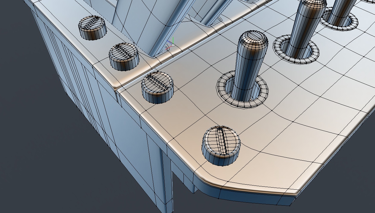 In general, you have to be willing to do several things to create a project like this. First, realize that there will be a lot of repetition of "procedures", such as the screws mentioned above. Second, to get some details right, you must be willing to sometimes spend hours pushing individual edges and vertices around. And finally, you must be willing to start over on certain parts of the project when you've screwed up. It's bound to happen on a project like this, (I'll provide some examples) so don't let it get you down.