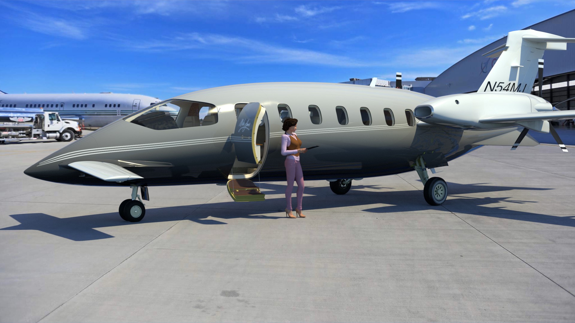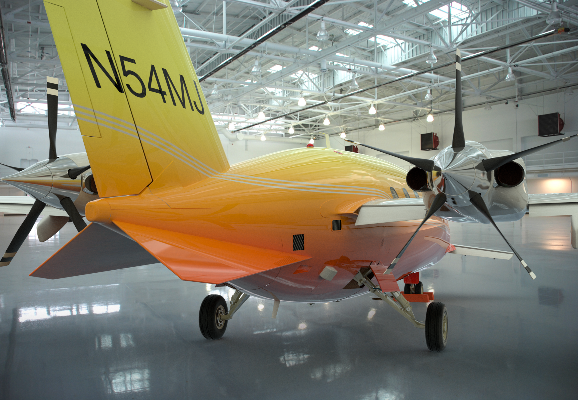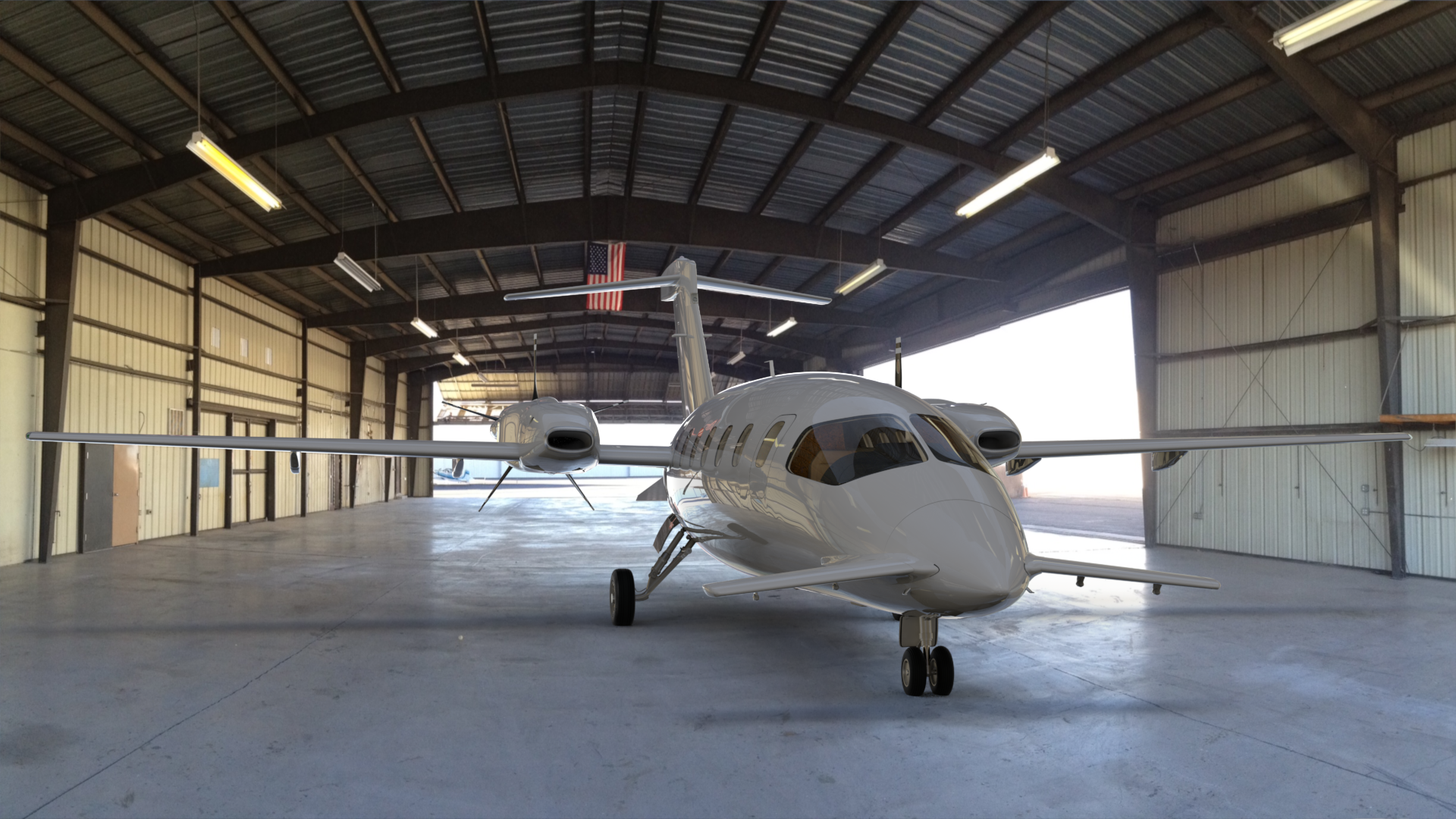 I found this photo of an empty aircraft hangar online, and composited the P180 into it, with a Shadow Catcher under the plane. To get the reflections right, I set up two different Environment Items. The first one used Front Projection, and is only visible to the camera, and to refraction rays. The second one uses Cubic Projection, and is only visible to indirect rays and reflection rays. I increased it's intensity to 200%, which let me eliminate all other lights and Environment materials. So, this render is lit by the images alone. This is a progressive render which I let cook for about 6 hours, until the noise was removed.