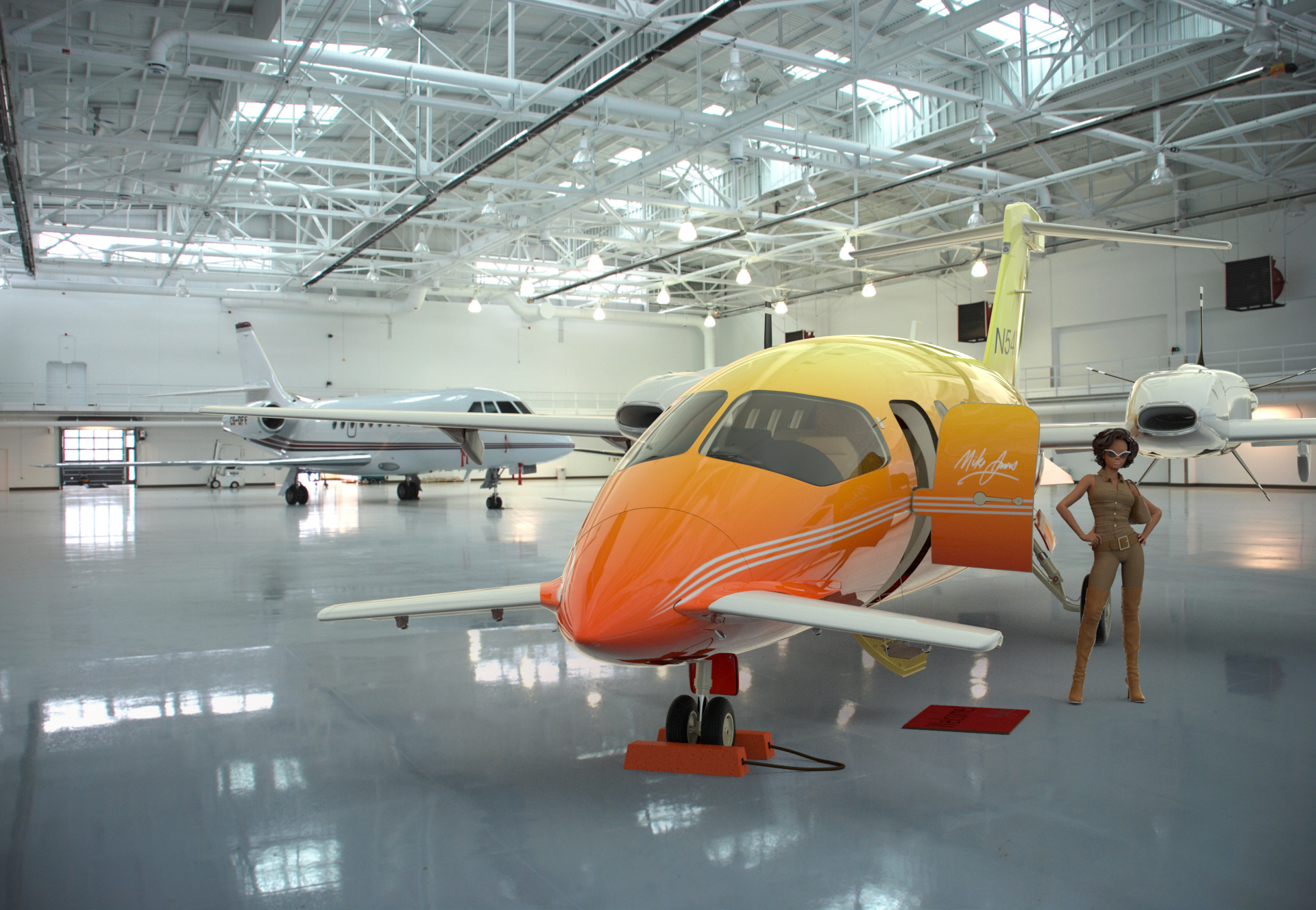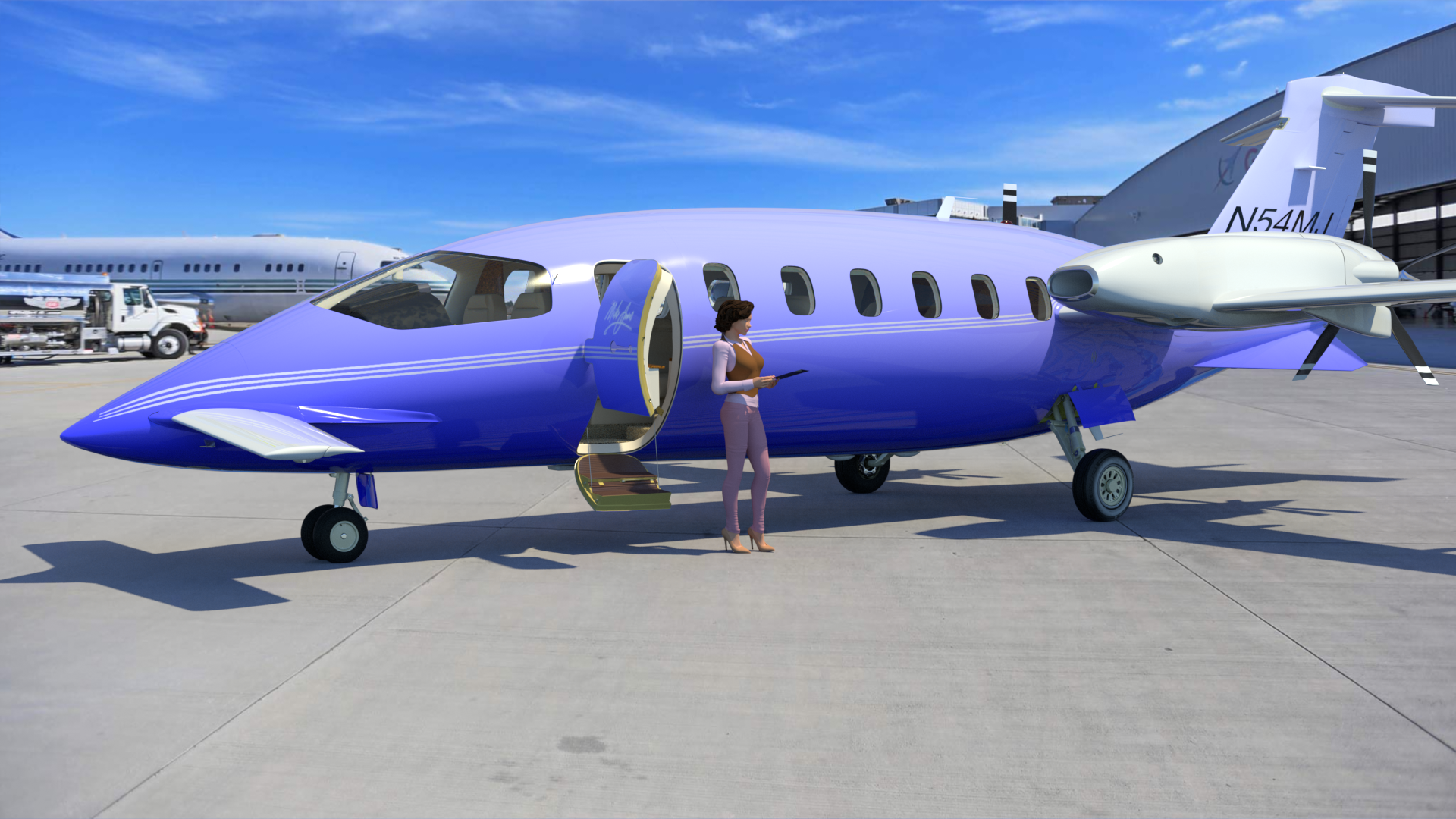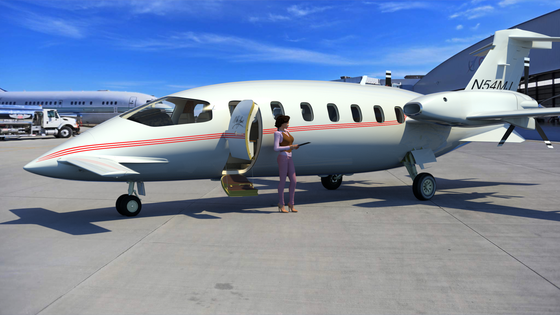 I found this photo of an empty aircraft hangar online, and composited the P180 into it, with a Shadow Catcher under the plane. To get the reflections right, I set up two different Environment Items. The first one used Front Projection, and is only visible to the camera, and to refraction rays. The second one uses Cubic Projection, and is only visible to indirect rays and reflection rays. I increased it's intensity to 200%, which let me eliminate all other lights and Environment materials. So, this render is lit by the images alone. This is a progressive render which I let cook for about 6 hours, until the noise was removed.