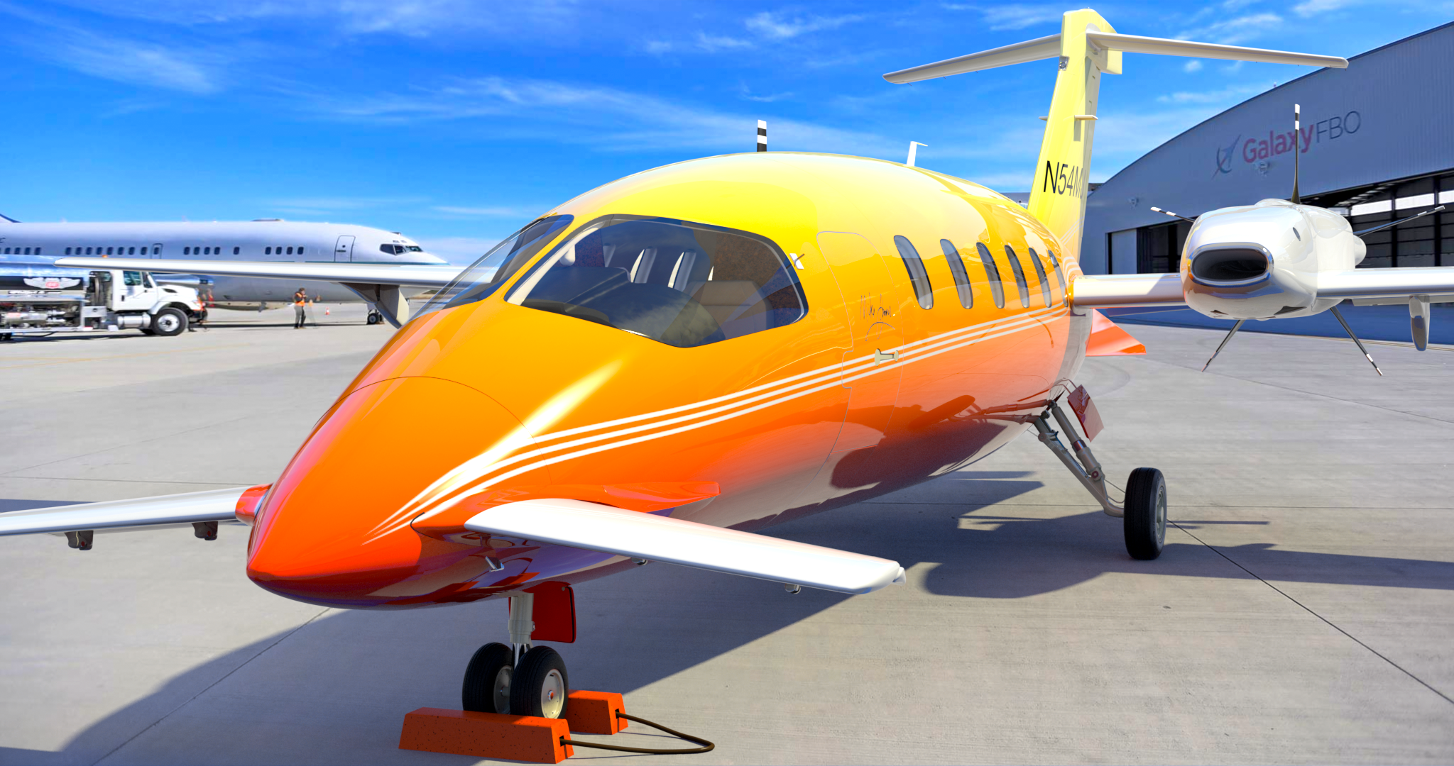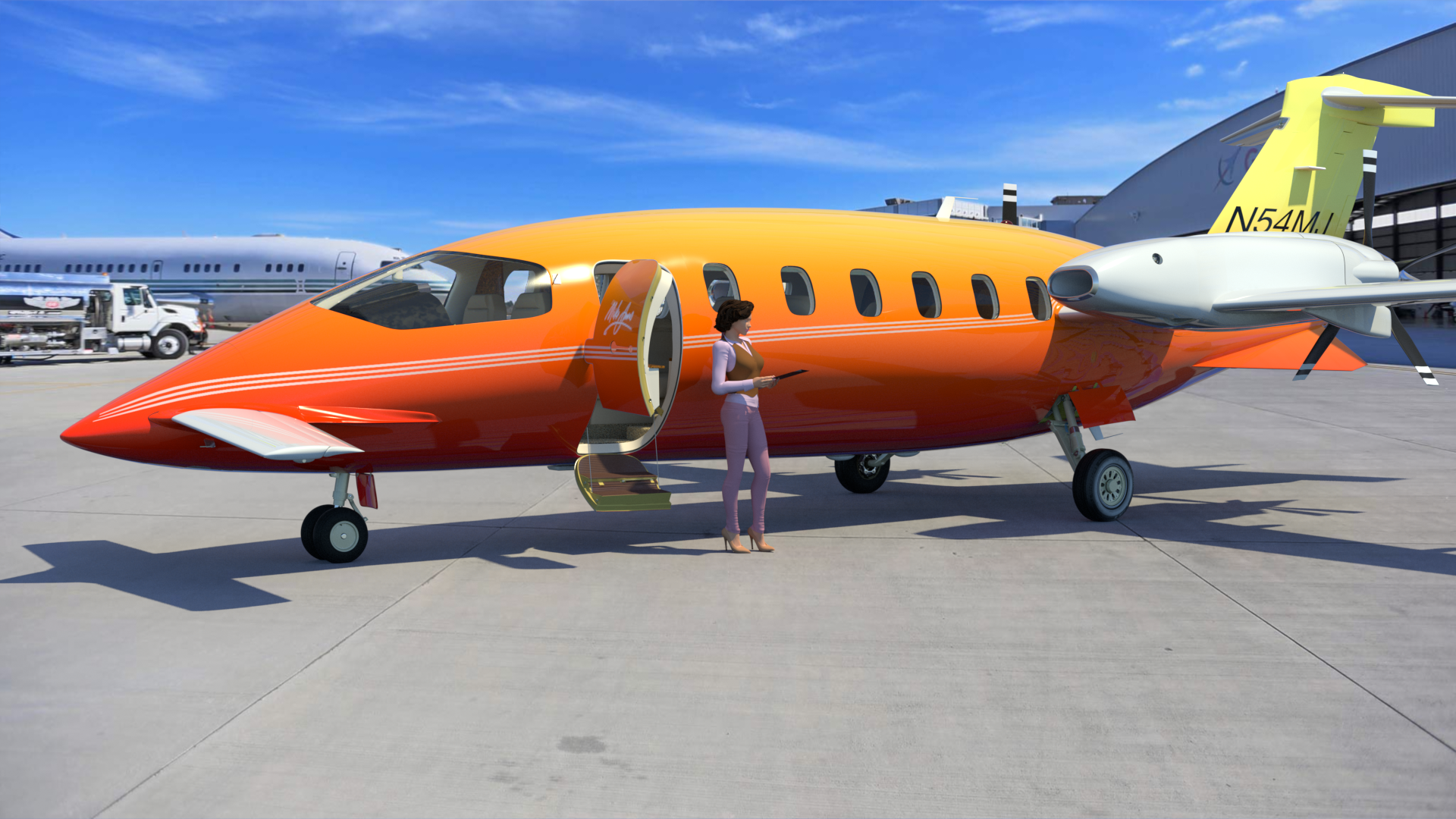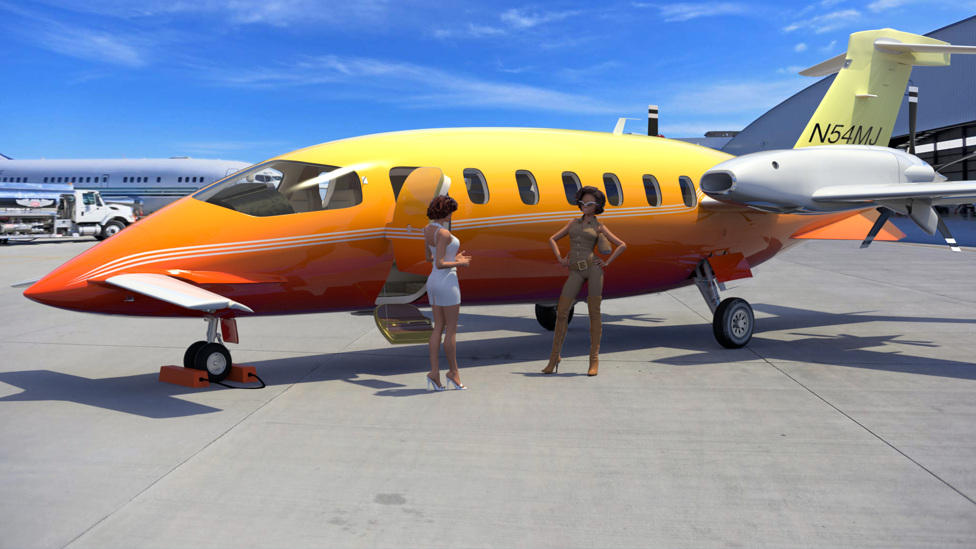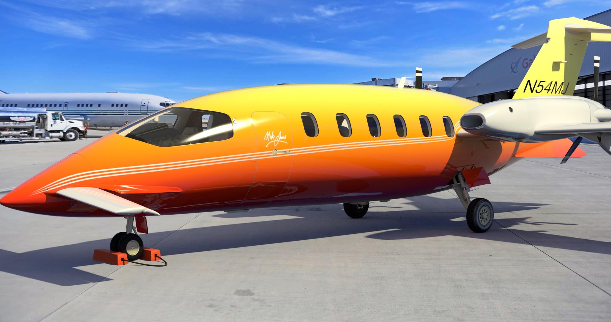 The typical real-world corporate-type paint for this aircraft is simple and elegant, consisting of the base white color, with three flowing stripes running the length of the fuselage and tail. That’s easy, but I wanted to create a more flashy, colorful scheme, as though I own the aircraft, and was having fun with it. So, I decided on a red/orange/yellow gradient-type color scheme for the fuselage, along with some stripes.