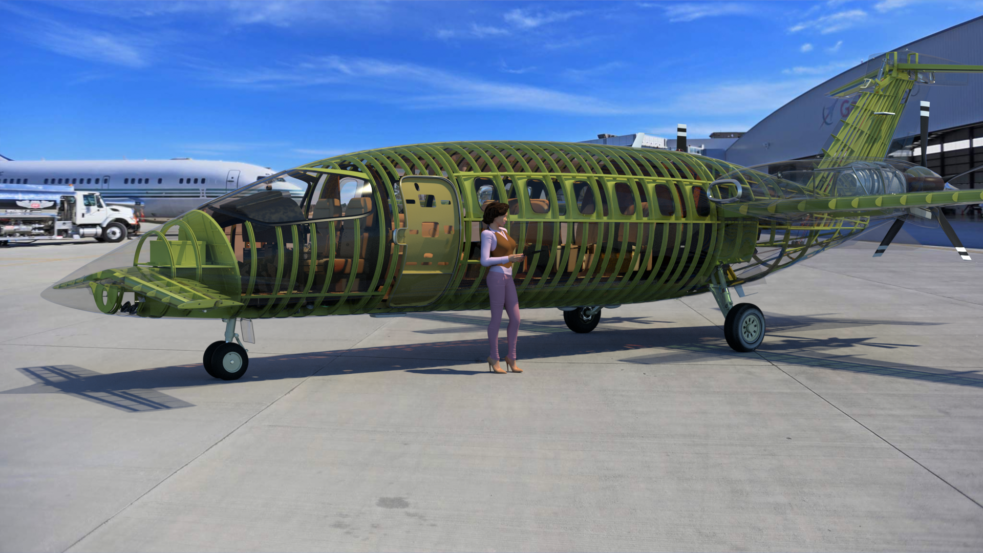 If I toggle the “Custom_Fuselage_and_Tail_Paint” mask off, I can simply toggle the masks on and off in the layer below (“Avanti_Metal”) to depict the model with it’s overall base white metal color, in a painted “primer” color, or an unpainted “Steel” color. By toggling the masks just above that, I can make the outer skin transparent, and if I like, I can add the Cel Edges material to add a bit of definition to the transparent skin seams.