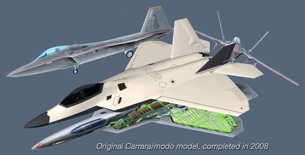 My original model was built in 2007, using Carrara 4. When I switched to MODO in 2008, it was the first model I updated, and that definitely improved the quality. I live in Anchorage, Alaska, where we have two squadrons of F-22's, based at Elmendorf Air Force Base. So, I've seen the flight demonstrations by Major Paul "Max" Moga and others. and have photographed the aircraft at several Elmendorf displays. In addition to that, there are now many more photos of the aircraft available on the web, so my documentation has greatly improved.