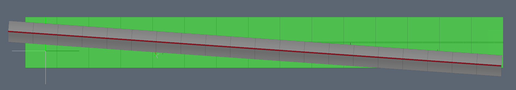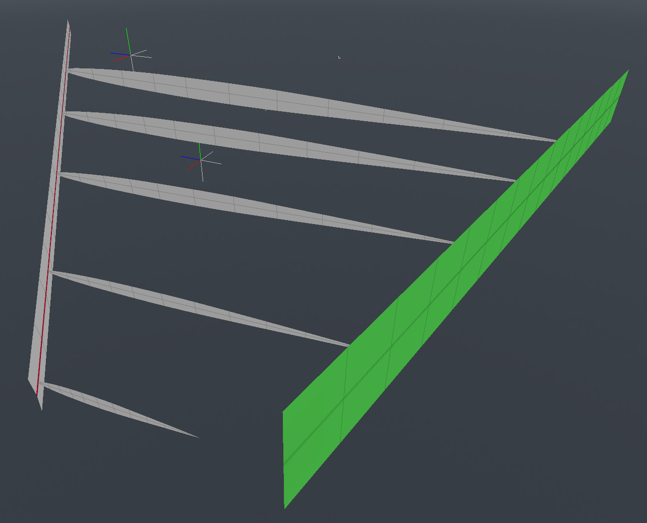 The wing setup: The green-colored guide in the image is just to show me a horizontal line, so I could keep an eye on the trailing edge twist. The more important guide in the front, with the red polygons, shows me where the nose of each rib needs to go, in order to preserve the straight edge of the leading edge flap, which is angled downward.