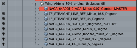 First, I was especially careful in creating the overall shape. I did this by using one of the airfoils that is claimed to be similar to the ones used on the actual aircraft. (NACA 64A004) I traced this in MODO over a backdrop image, and then duplicated it four times, giving me five sections to work with. These were scaled to 80% of their actual thickness, after a lot of trial and error, which looked about right, based on both the reference drawings and photos. I then scaled their overall size to match the shape in the top view. Finally, I rotated each one to a different angle of attack, to create the wing twist and taper (washout) of the actual wings. Bridging their edges produced the wing shape, and adding a bit of edge-weighting keeps them sharp at the corners. This took several iterations, until I was satisfied that I had the right shape, and the time spent was worth it, because if the overall shape isn’t right, then it won’t match with the fuselage properly, and also, the control surfaces and everything that follows will be wrong too.