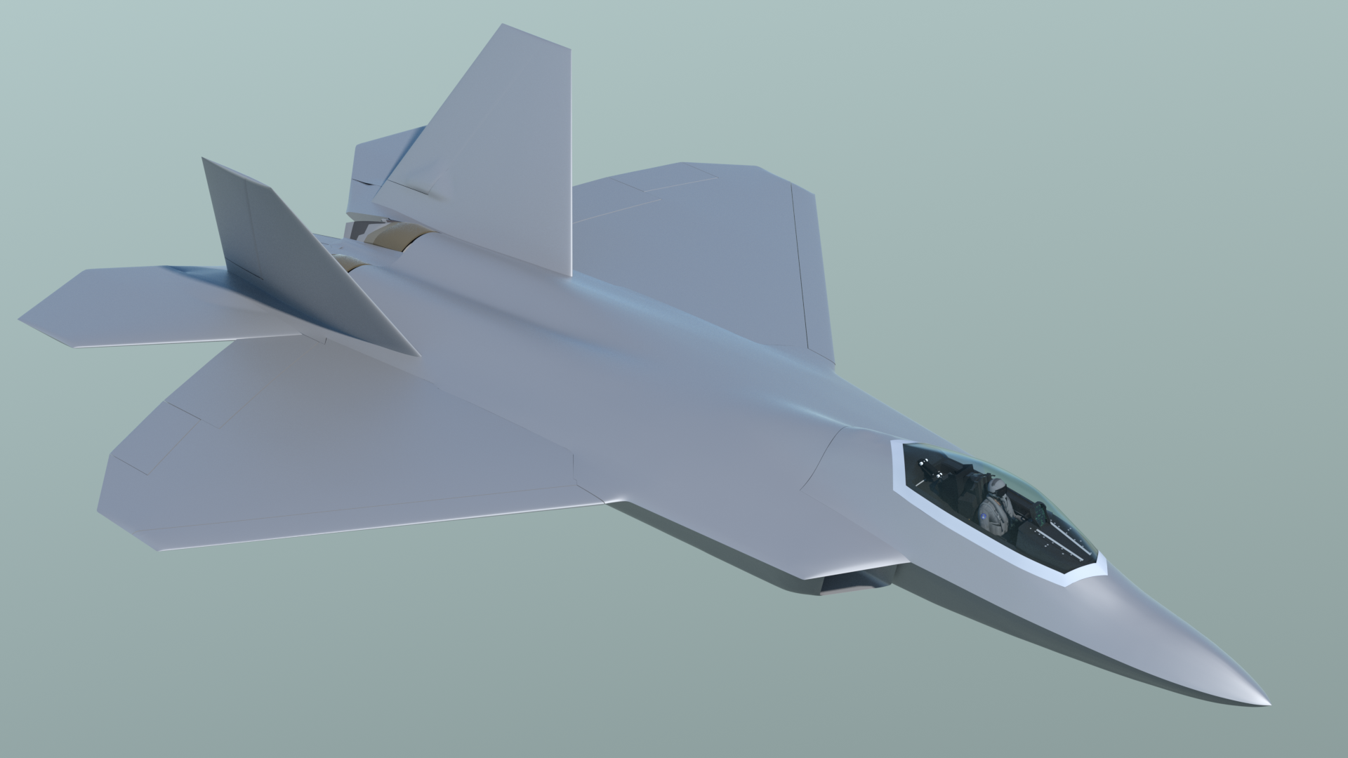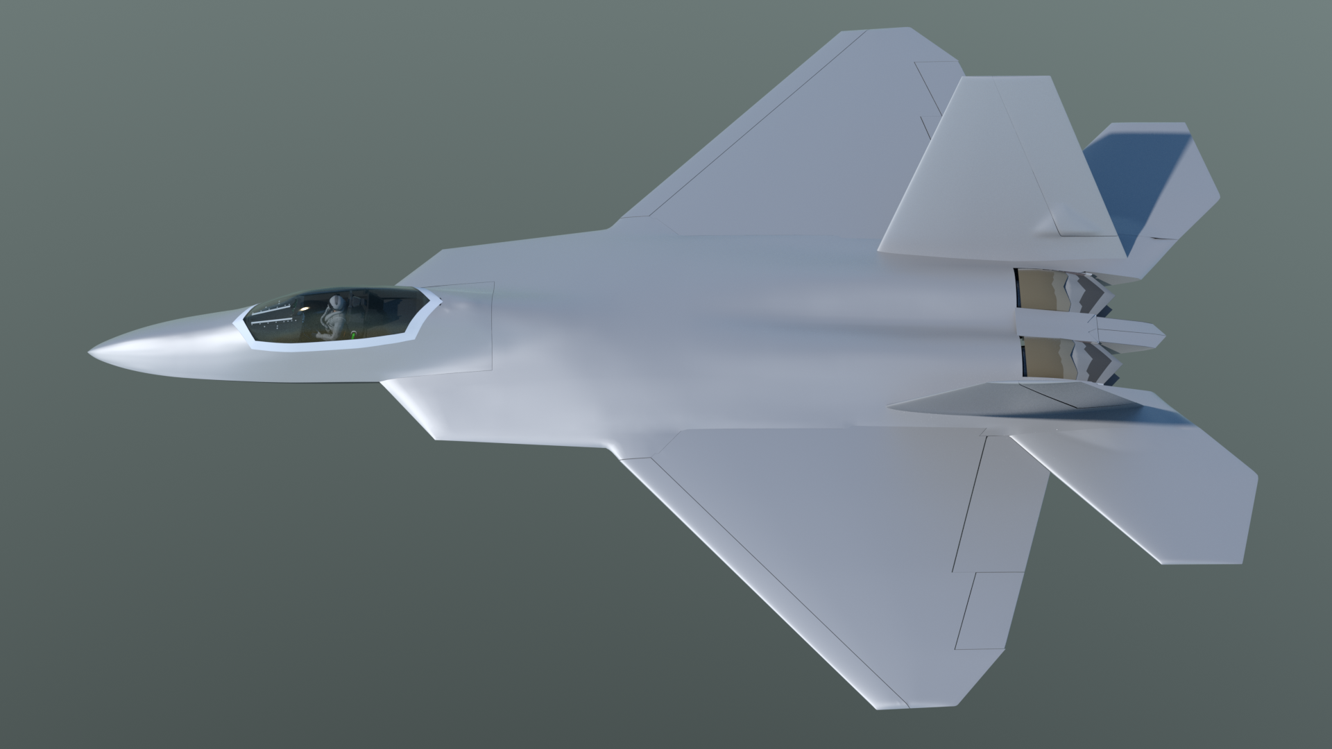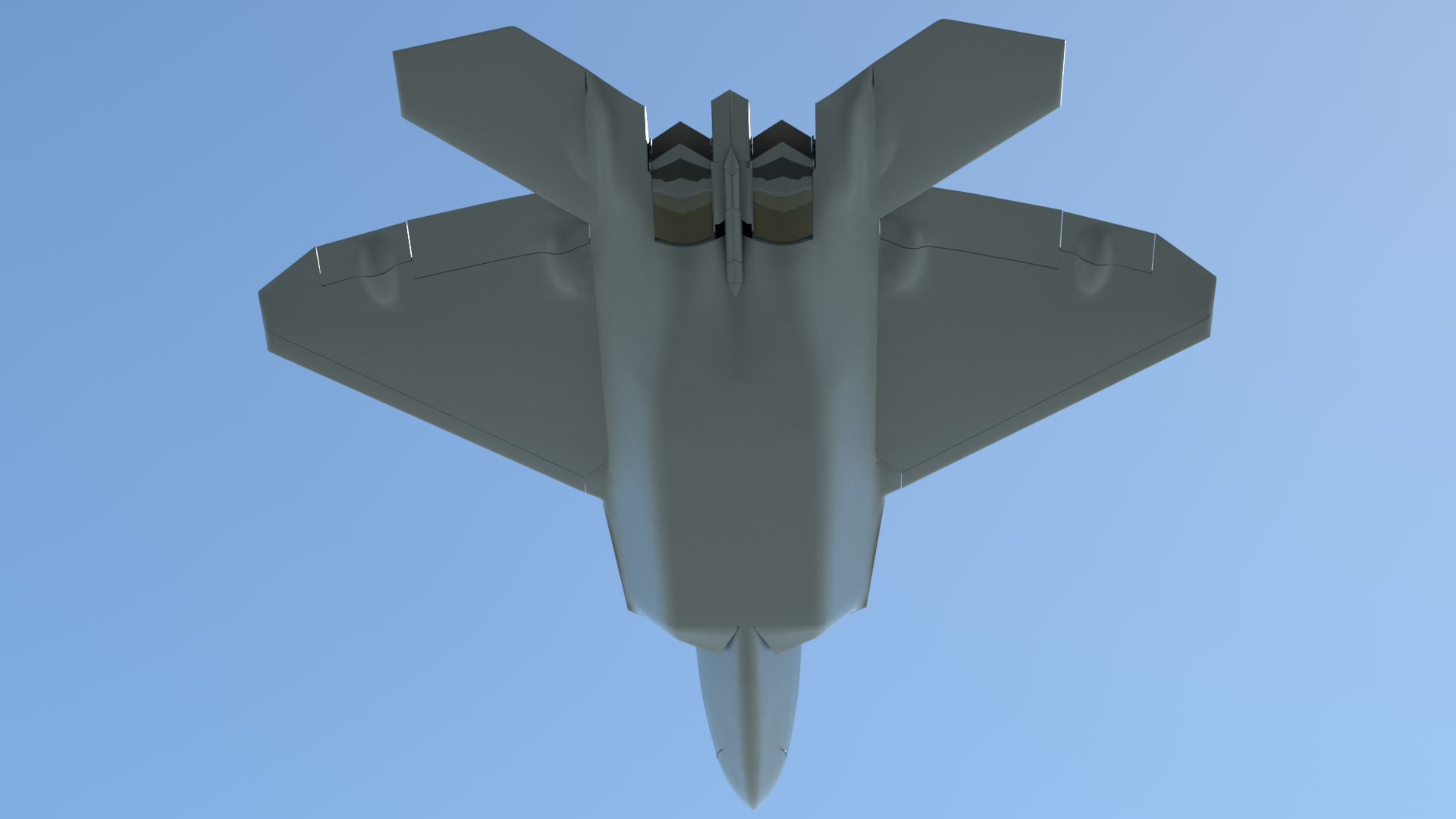 There are some things that can’t be done with shortcuts. For example, doing a variety of selections and smoothing inevitably produces a little “lumpiness” in a dense mesh. So there were times when I turned on symmetry, went to Vertices mode, and got very close-up to the mesh, making very small corrections with the move tool, and using Edge Slide to adjust the polygon flow. Reflection mode is really useful for this, especially with the wireframe and vertices turned off. Obviously it’s also helpful to use a highly-reflective material, moving the main light around, and do some preview renders, in order to spot more areas to fix. I created a base material called “F22_Metal”, and used it for that. It also contains the blue-green ‘factory” color in the same group, so I can just turn it on and off, to compare the look of the model in different lighting situations.