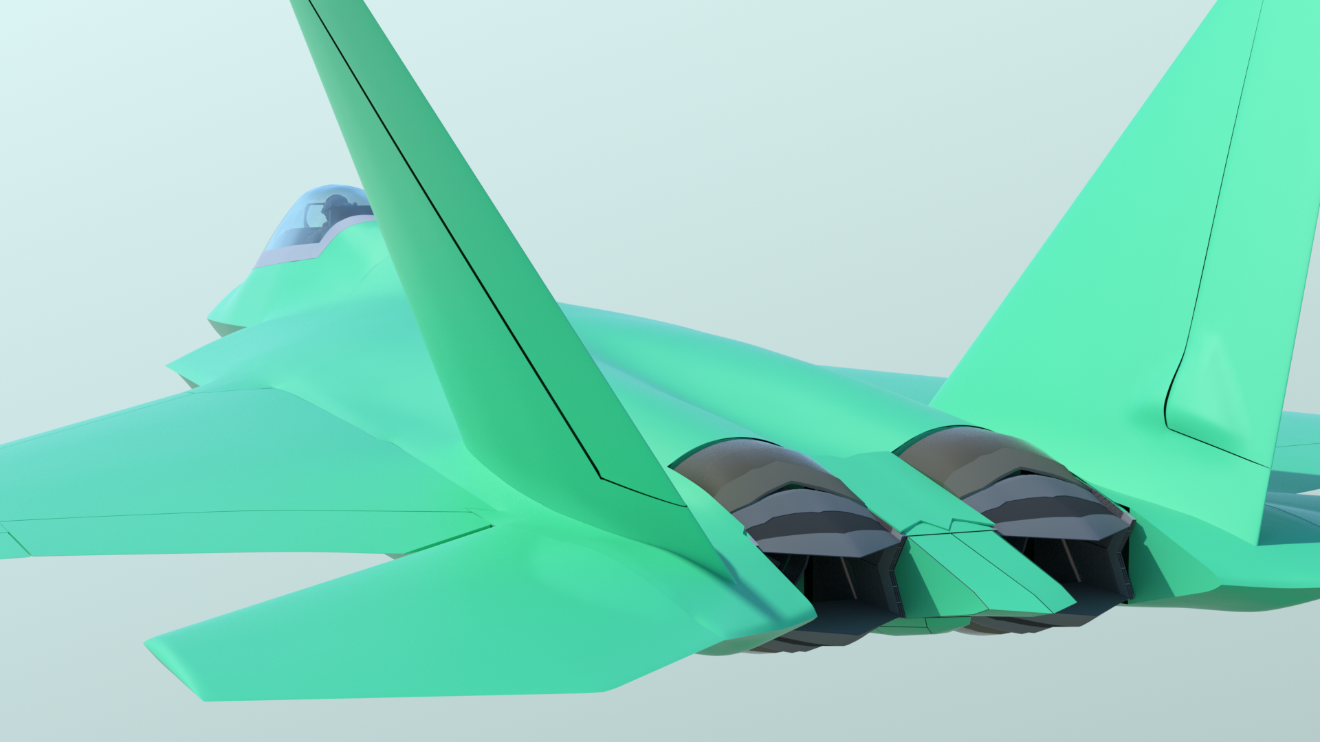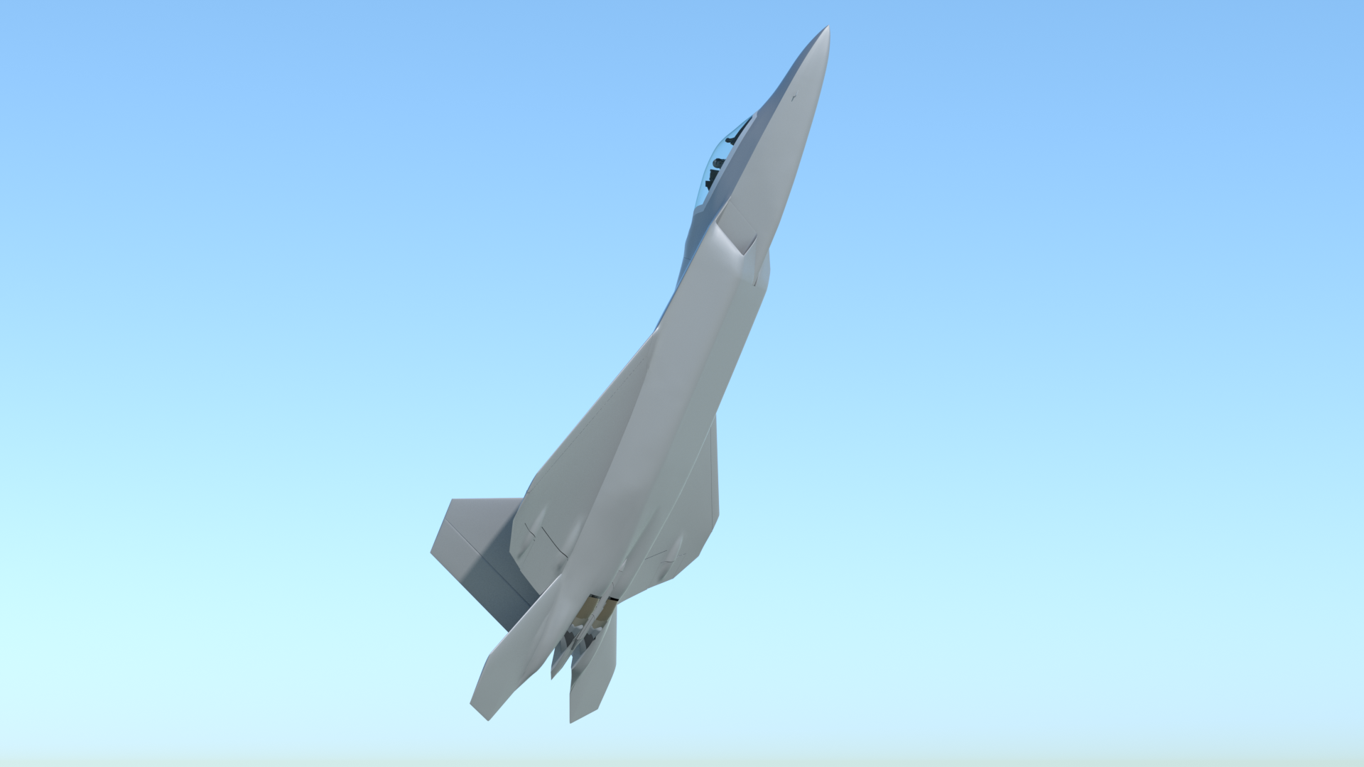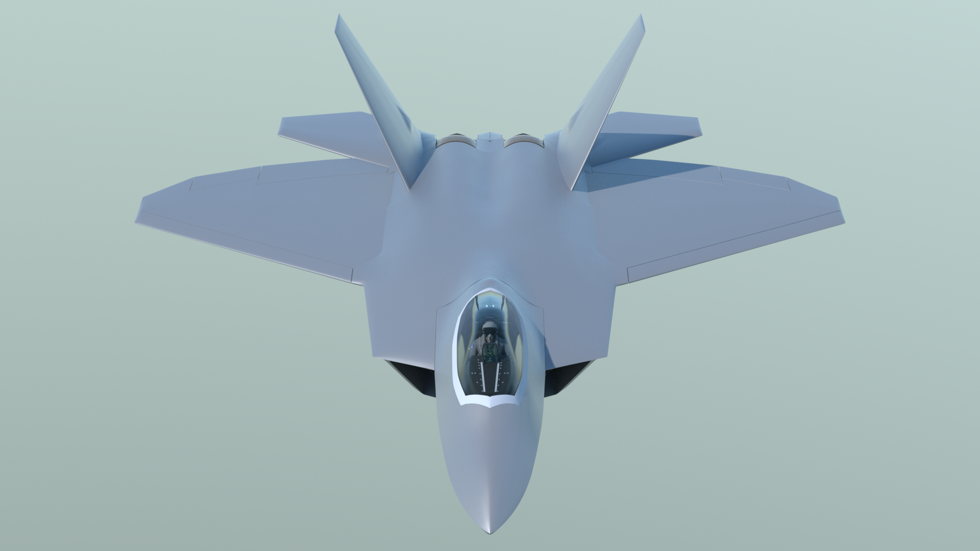 There are some things that can’t be done with shortcuts. For example, doing a variety of selections and smoothing inevitably produces a little “lumpiness” in a dense mesh. So there were times when I turned on symmetry, went to Vertices mode, and got very close-up to the mesh, making very small corrections with the move tool, and using Edge Slide to adjust the polygon flow. Reflection mode is really useful for this, especially with the wireframe and vertices turned off. Obviously it’s also helpful to use a highly-reflective material, moving the main light around, and do some preview renders, in order to spot more areas to fix. I created a base material called “F22_Metal”, and used it for that. It also contains the blue-green ‘factory” color in the same group, so I can just turn it on and off, to compare the look of the model in different lighting situations.