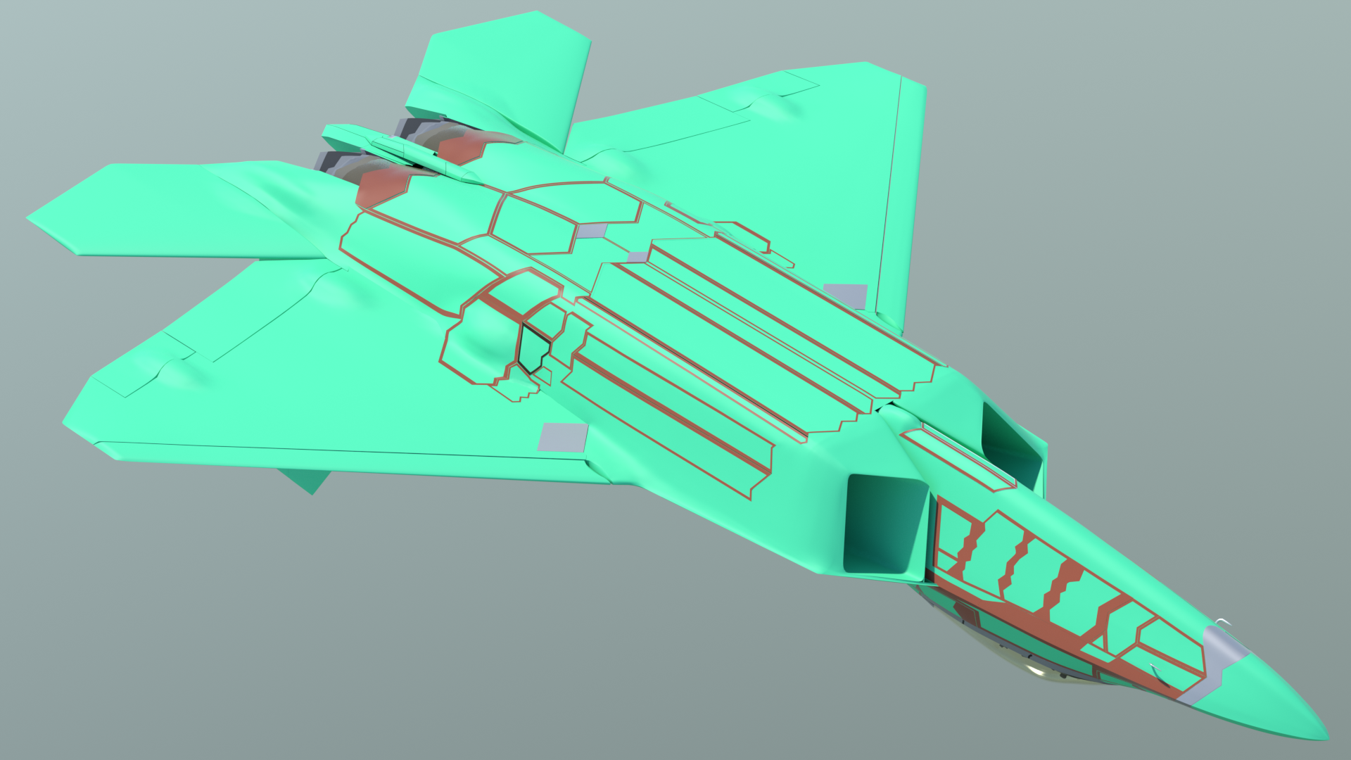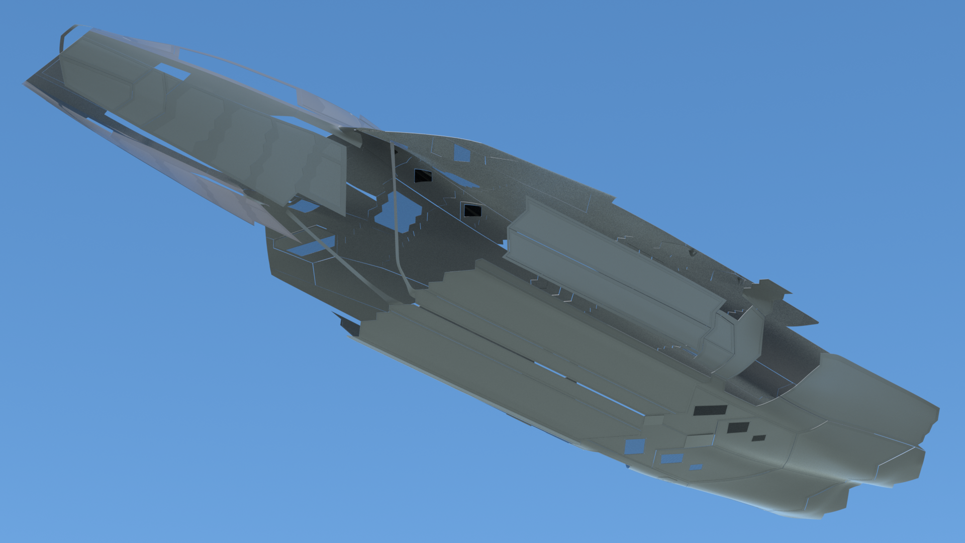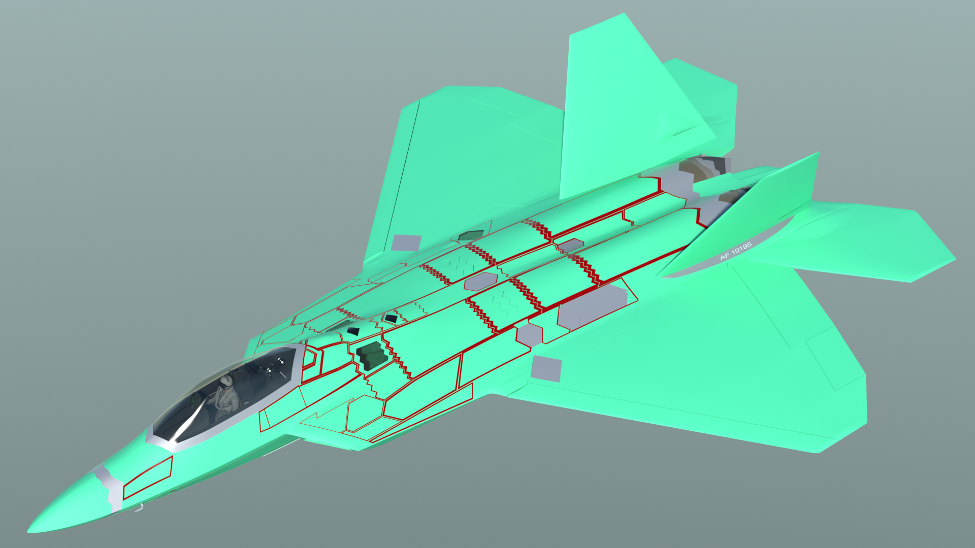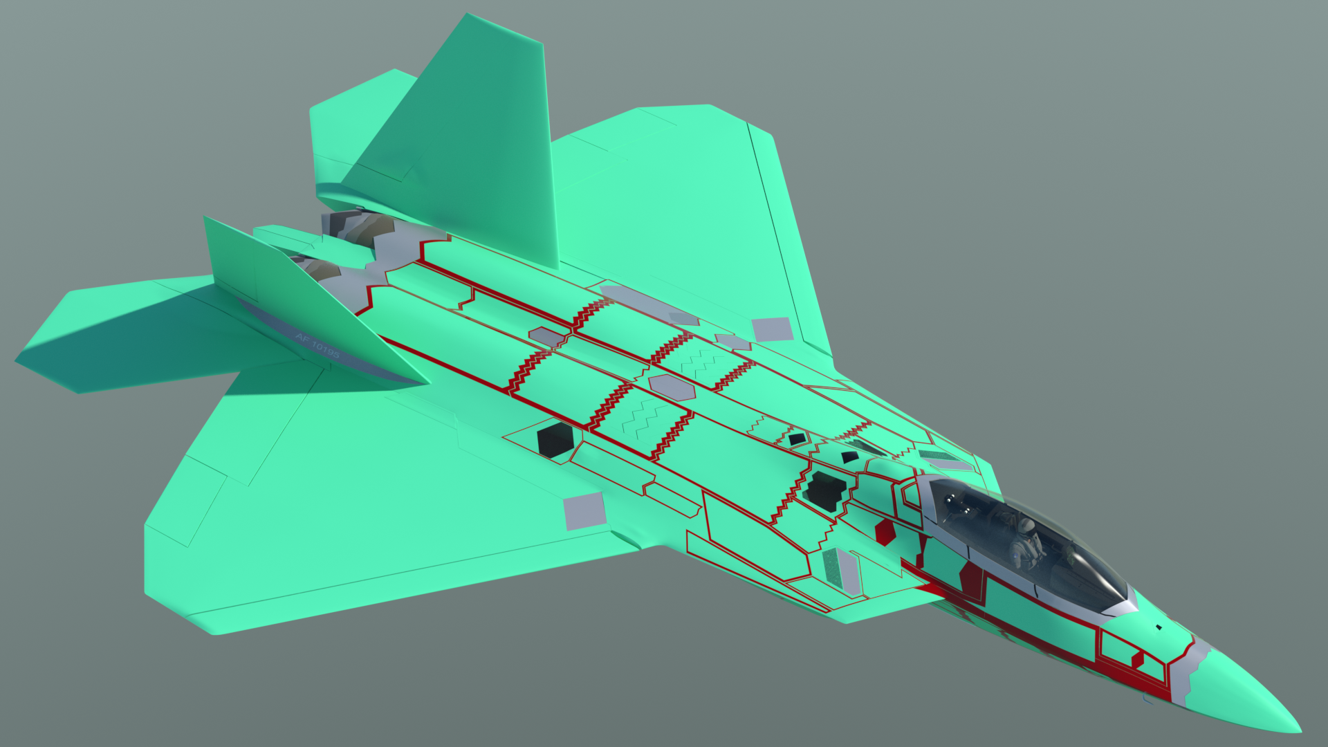 - The cockpit area. landing gear bays, and weapons bays have been simplified from the previous model, but in such a way that more accurate detailing can be added later. This basic "blocking in" of those parts allows exterior renders to be done, while I'm still working on the interior details.