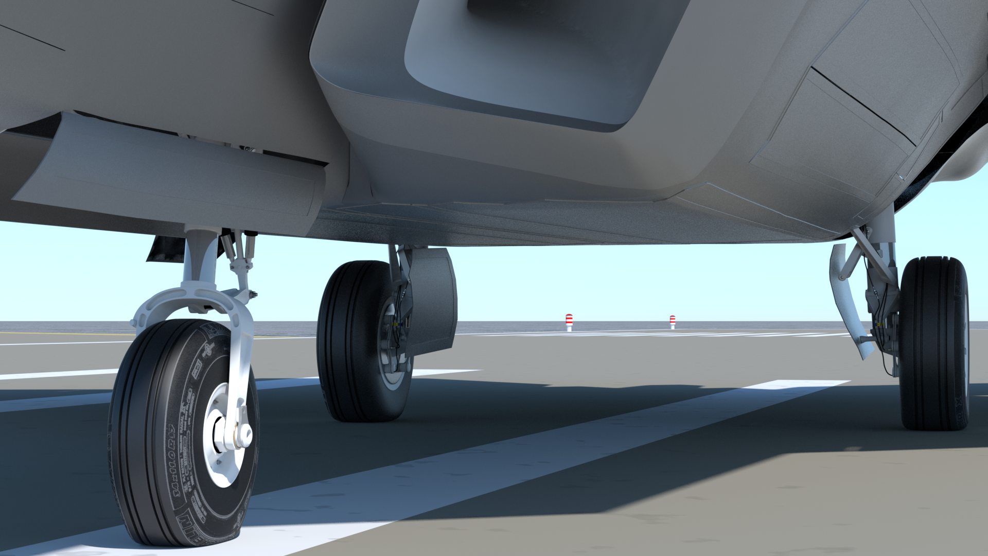 Below - Thanks to lessons learned from the updated version of Rich Hurrey's "Rigging Master Course" for MODO, I'm now adding the kind of rigging features that will enable the model to stand up in closeups. Here, you can see that deformers are enabled for all of the tires now, providing a small amount of "squash and bulge". The cool thing about the rig is that it works in all modes. On the ground, all of the wheels turn, the nose gear is steerable, and of course, all the landing gear extends and retracts.